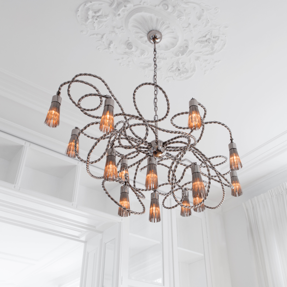 Suspended like a luminous courtly procession, Brand Van Egmond’s Sultans of Swing oval chandelier reinterprets imperial grandeur through sculptural modernity. Flowing arcs and meticulously hand-forged elements create a dynamic silhouette, casting regal patterns of light and shadow across grand dining rooms, soaring entrance halls, and architect-designed interiors.