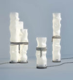 A soft, whimsical glow radiates from Contardi’s Baggy table lamp, capturing an informal elegance inspired by the oversized trousers that lend it its name. The crumpled double-satin polycarbonate diffuser, paired with a white and grey textile cord and grey-finished base, shapes curated residential and boutique interiors with playful architectural nuance.
