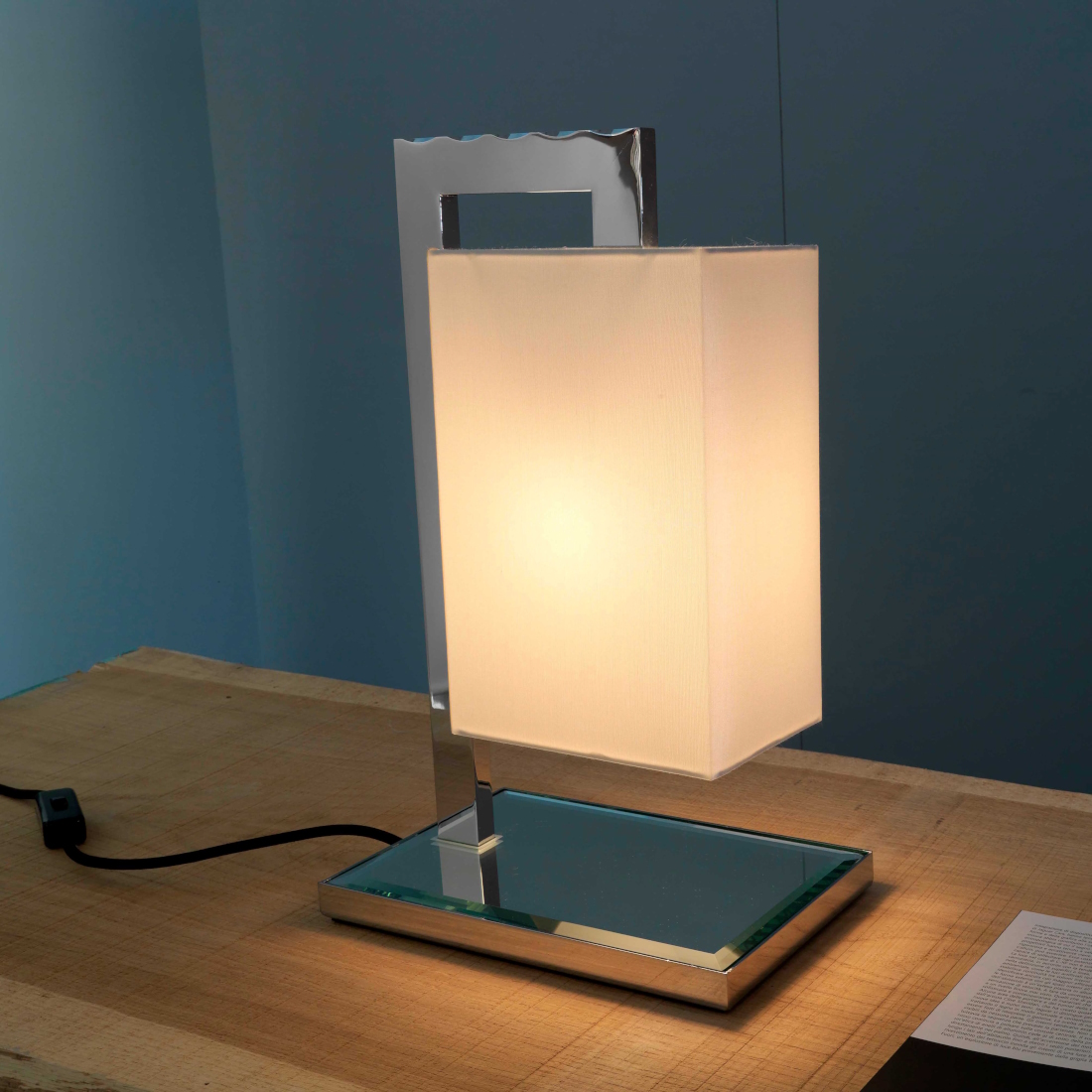 This table lamp features a polished nickel frame with a bevelled mirror accent, paired with a shade crafted from White Cotton 800, offering a sleek and elegant design.