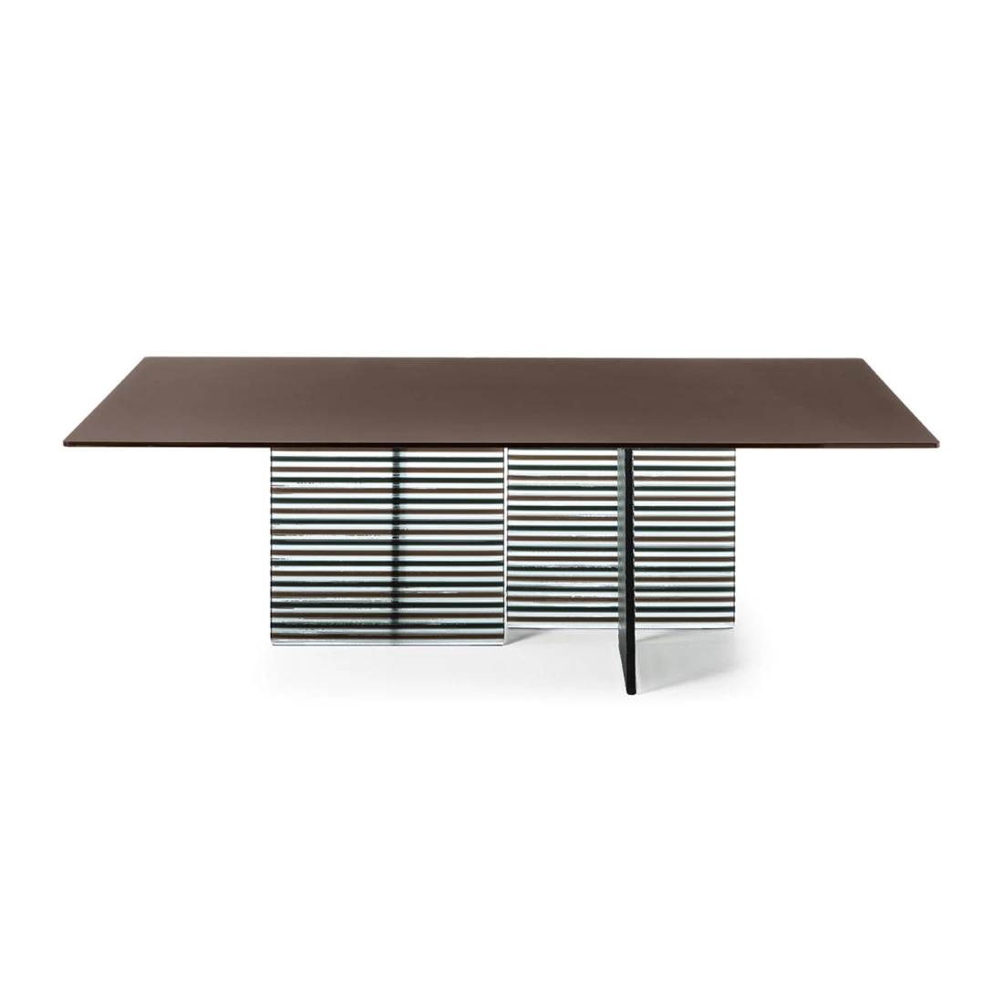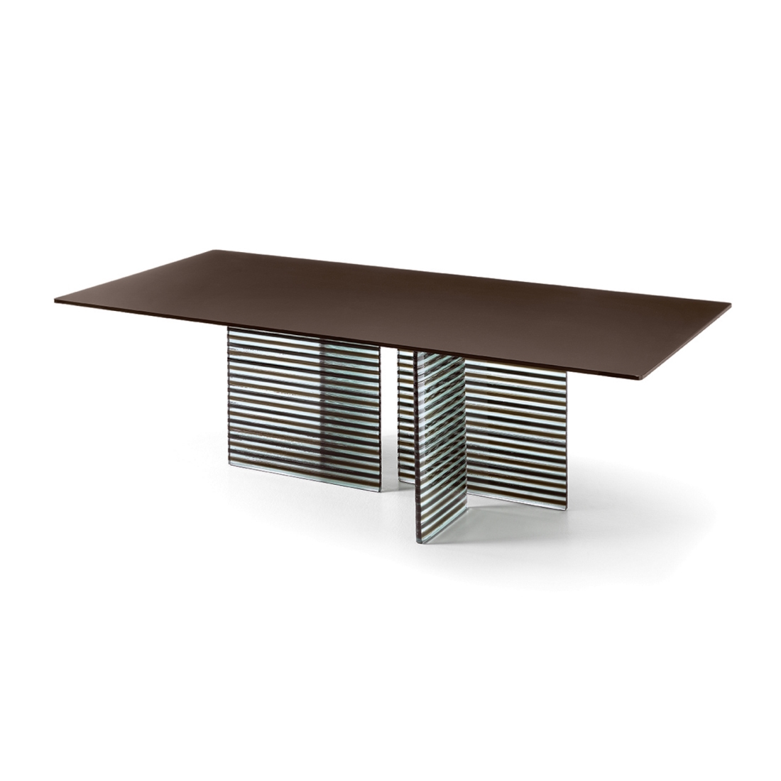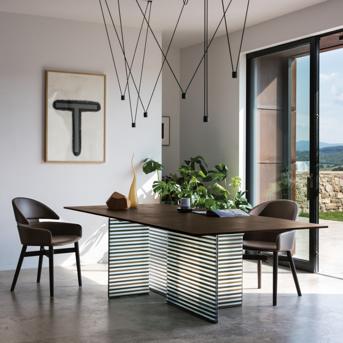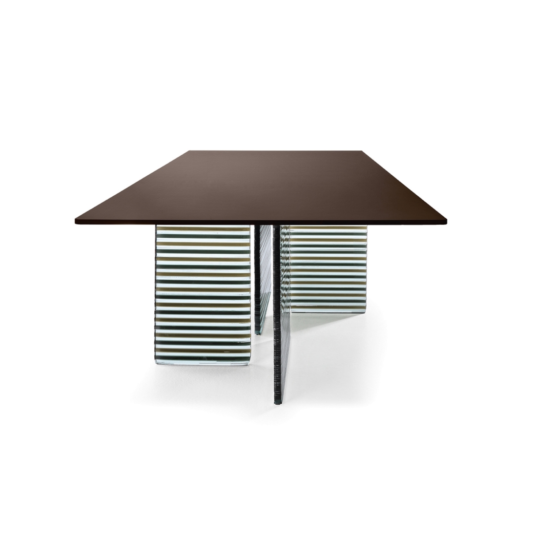 This dining table features a 15mm-thick tempered glass top that’s either transparent and back-lacquered in monochrome colours, hand-finished with Ecomalta for a finer-grained texture, or veneered in Canaletto walnut with a Tobacco finish. The table is supported by a base consisting of either four or six separate 30mm DV Glass elements adorned with coloured stripes.
