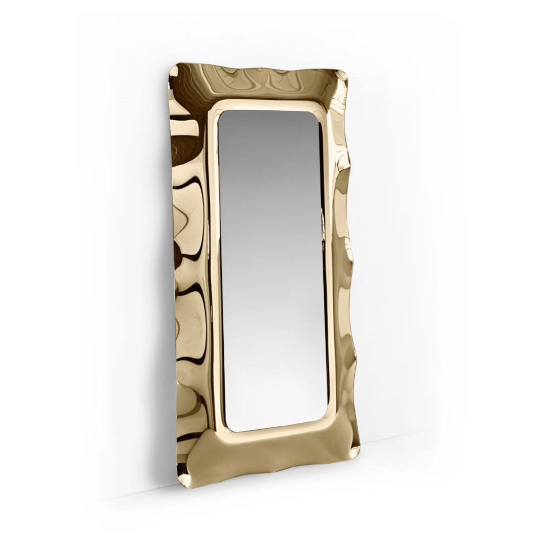 Free-standing or hanging mirror crafted from 6mm high-temperature melted glass, bronze back-silvered, with a 5mm flat mirror. The rear frame is made from painted metal. The central mirror is standard mirror glass for true colour reflection but can be customised to match the frame finish upon request. Horizontal or vertical hanging.