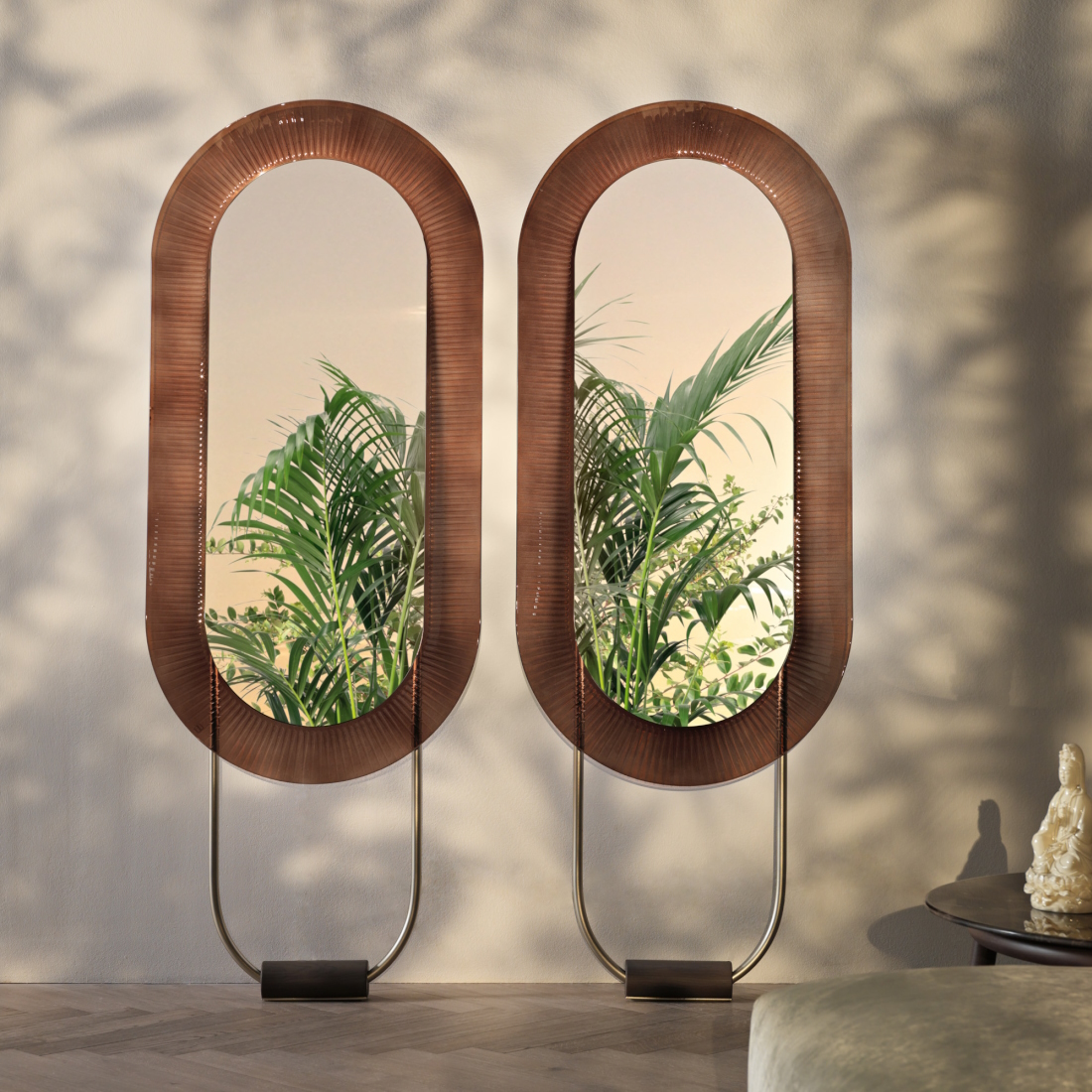 This floor-standing mirror features a 6mm high-temperature fused glass frame with semi-transparent back-painted finishes. The central mirror is 5mm thick. The metal structure is available in either Metallic Champagne or Vulcano Grey, and is complemented by a solid wooden foot in Tobacco or heat-treated black finishes.