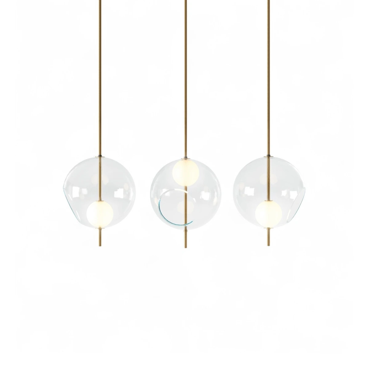 The spheres are supported by a burnished brass frame and illuminated by an integrated LED source that emits a warm, diffuse glow. Handcrafted in Italy, each pendant bears the subtle irregularities and air bubbles of traditional glassblowing—making every piece a sculptural study in material and light.