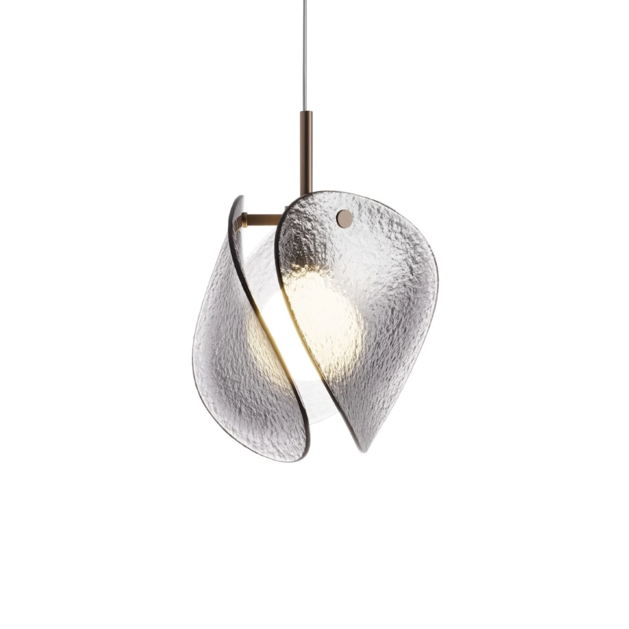 Formed from 6mm high-temperature fused glass, the shade is supported by a burnished brass stem and integrated LED source. The glass is available in smoked or bronze finish, diffusing light through its sculpted surface with atmospheric precision. Made in Italy, Tau brings together botanical inspiration and architectural restraint in a refined lighting sculpture.