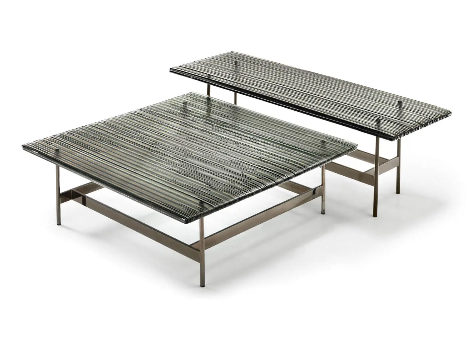 This coffee table comes with a 23mm DV Glass top, available in either transparent or coloured striped glass, or with a marble top. The metal base is offered in opaque Titanium or Black Glossy Nickel finishes.