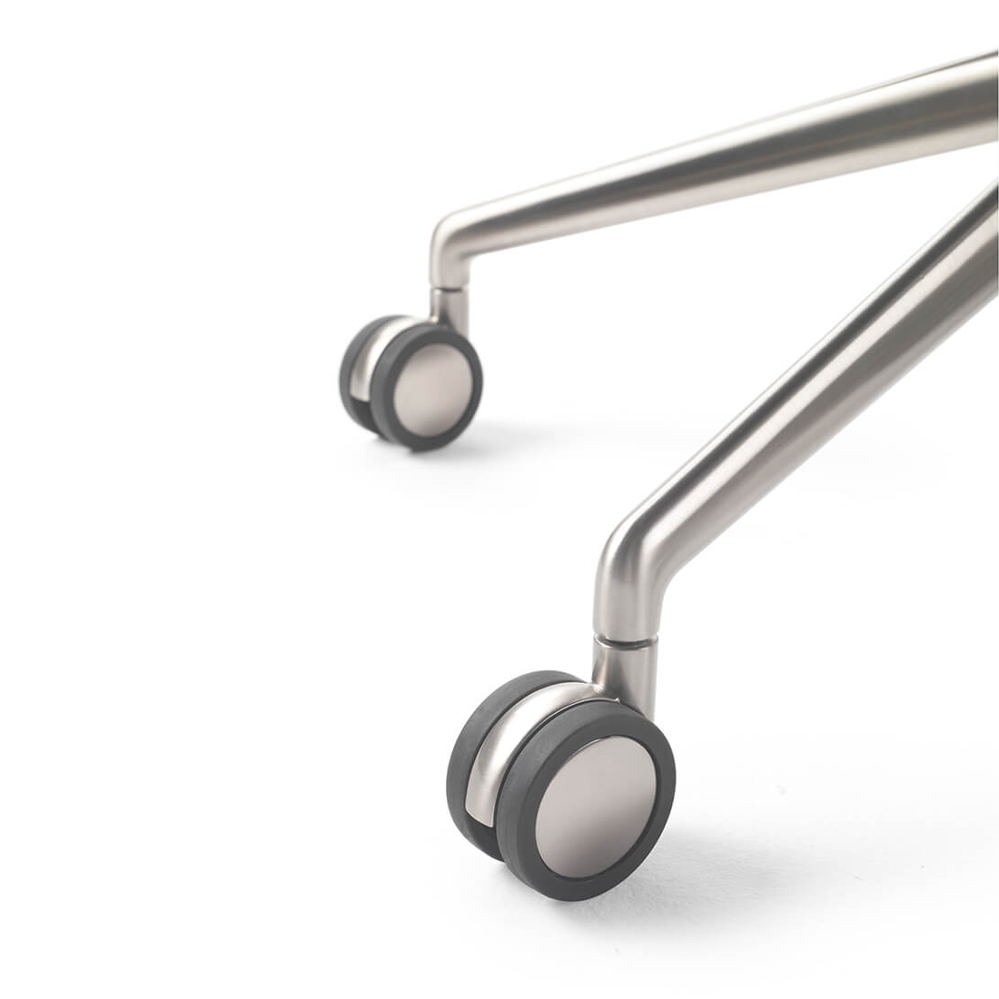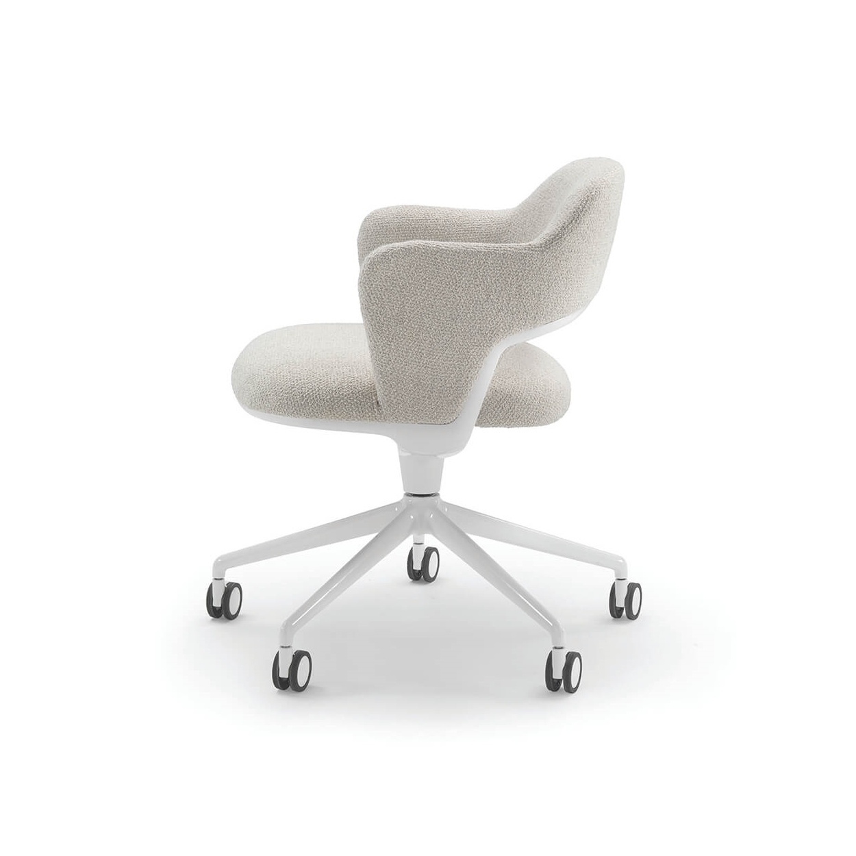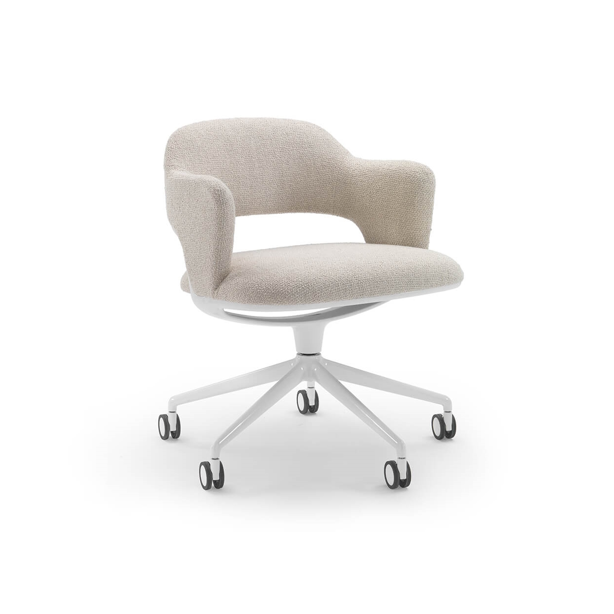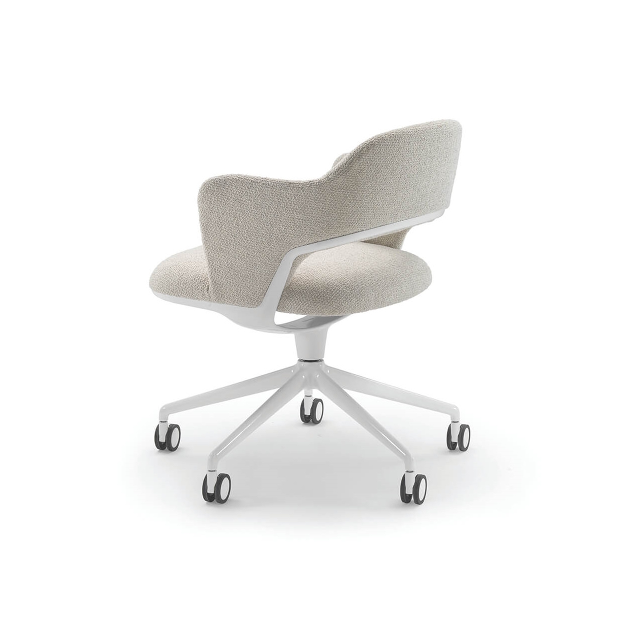 Made in Meda, Italy, the Alma chair features a concealed metal core encased in moulded polyurethane and laminated fabric. A five-spoke castor base in satin, chrome, burnished, black chrome, anthracite, or white integrates a smooth swivel mechanism. Upholstery is non-removable and available in Flexform’s fine leathers or woven fabric selection.