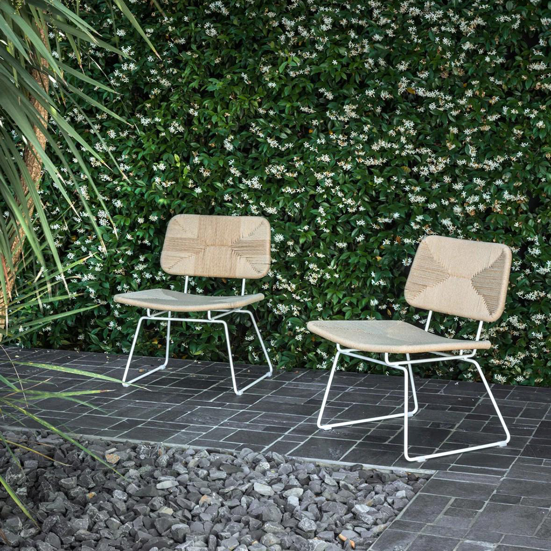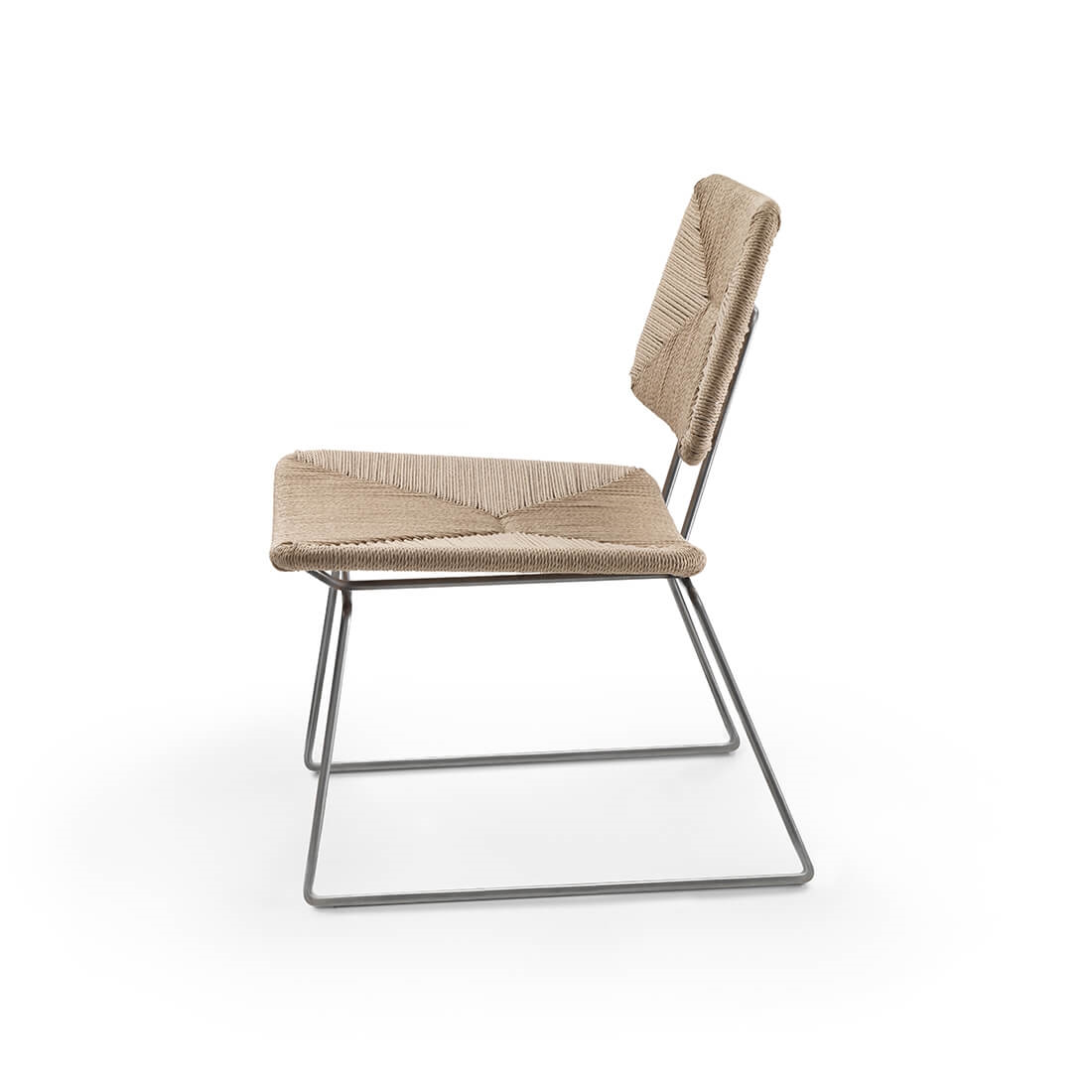 The structure is available in electropolished 316 stainless steel or a variety of finishes including epoxy powder-coated white, wine red, and khaki green. Seat and backrest feature 316 stainless steel with a woven matt polypropylene cord in colours such as natural and anthracite. The armrest can be finished to match the structure and the feet rest on durable thermoplastic tips. An optional waterproof cover is also available.