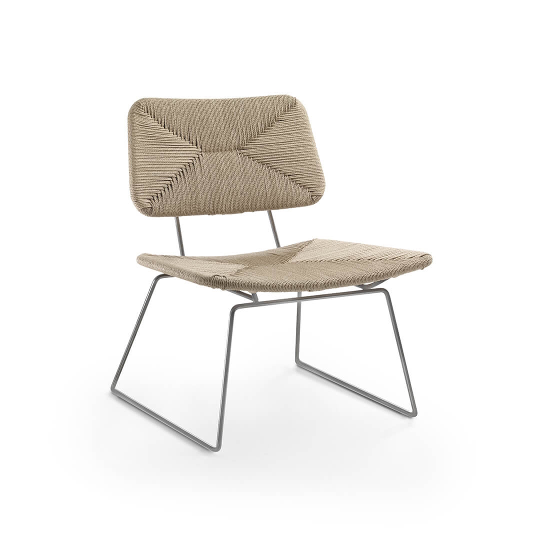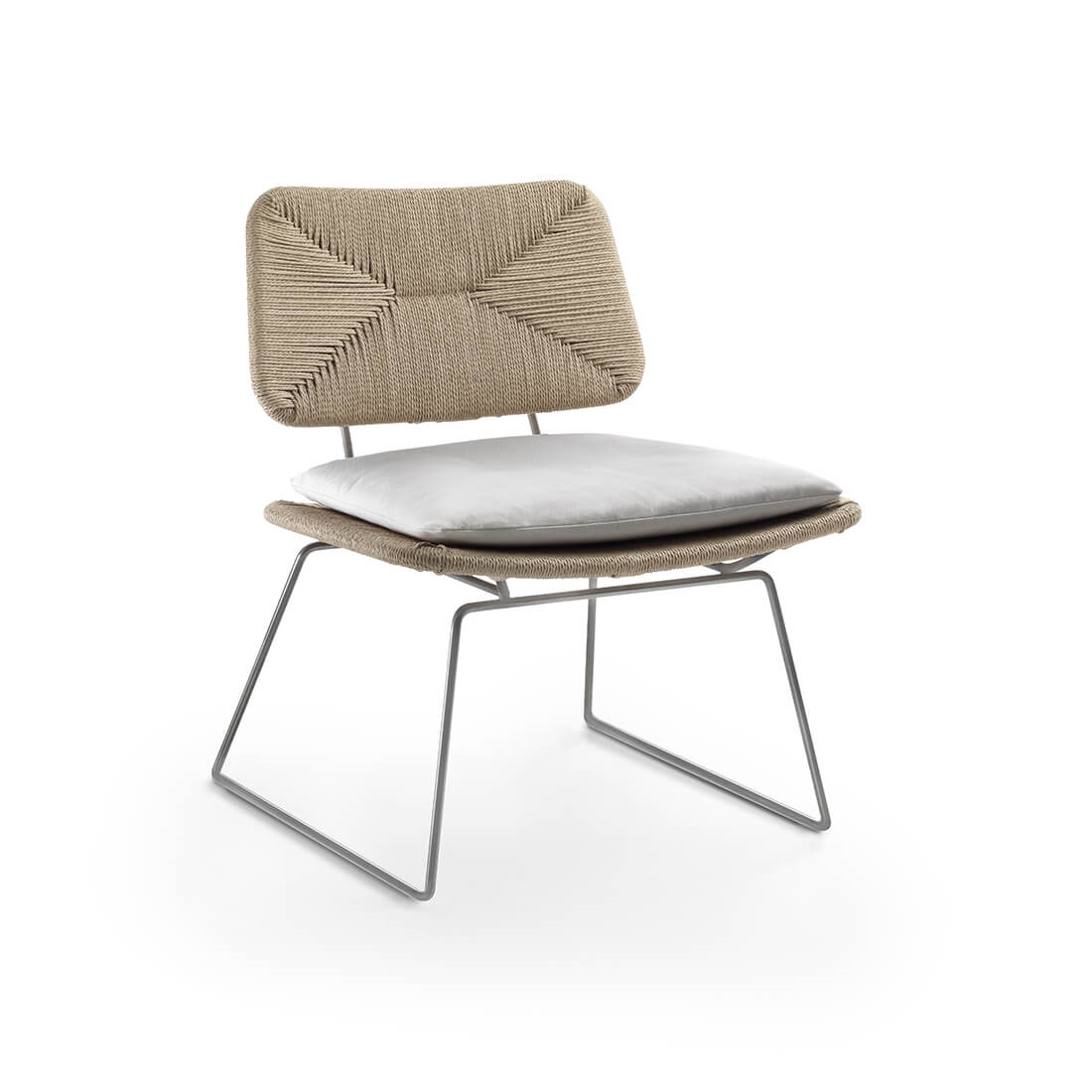 The Echoes outdoor armchair by Flexform reinterprets classic weaving traditions through a contemporary lens. Its linear stainless steel frame offers an architectural foundation, while the seat and backrest are handwoven in matt polypropylene cord—an homage to Mediterranean craftsmanship expressed in a modern material.