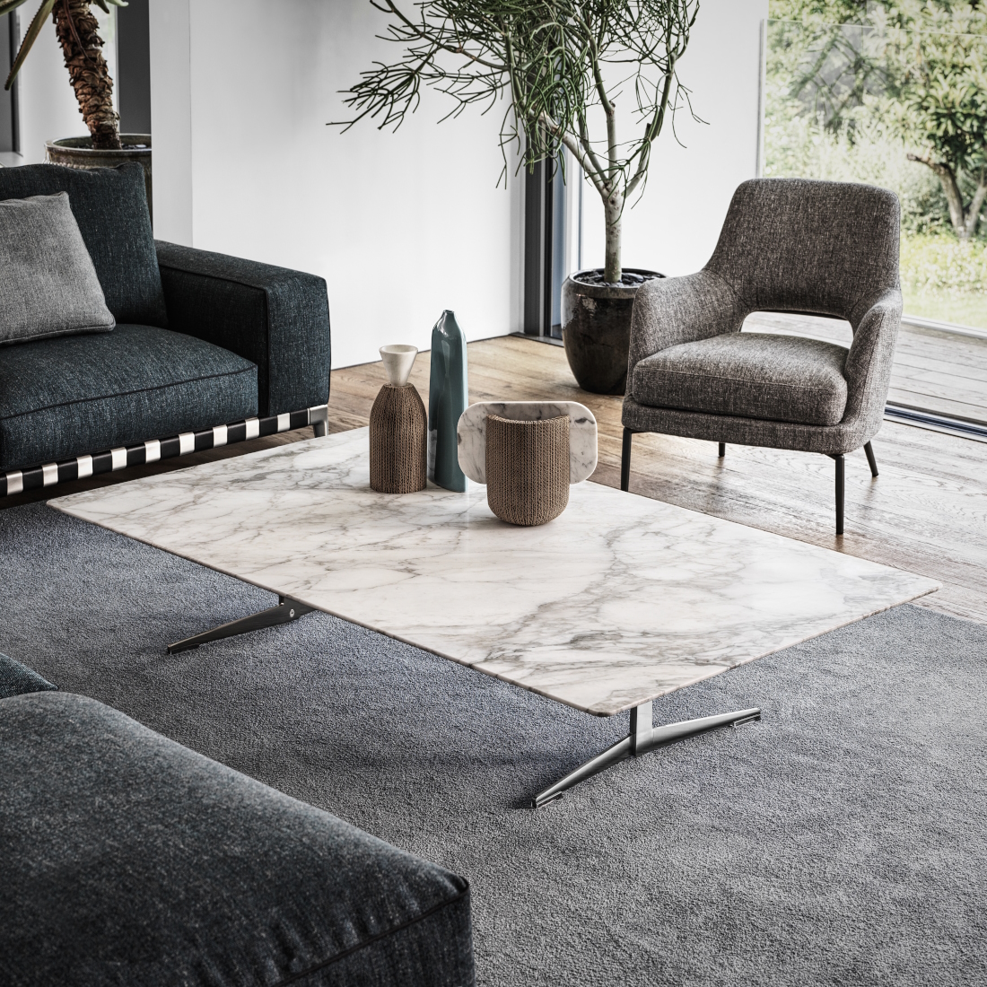 Offered in a range of shapes and sizes, Fly adapts to varied spatial compositions, from gallery-style lounges to formal living rooms. Whether positioned centrally or layered beside a modular sofa, it functions as both a practical surface and a visual anchor—expressing Flexform’s enduring commitment to material excellence and understated design.