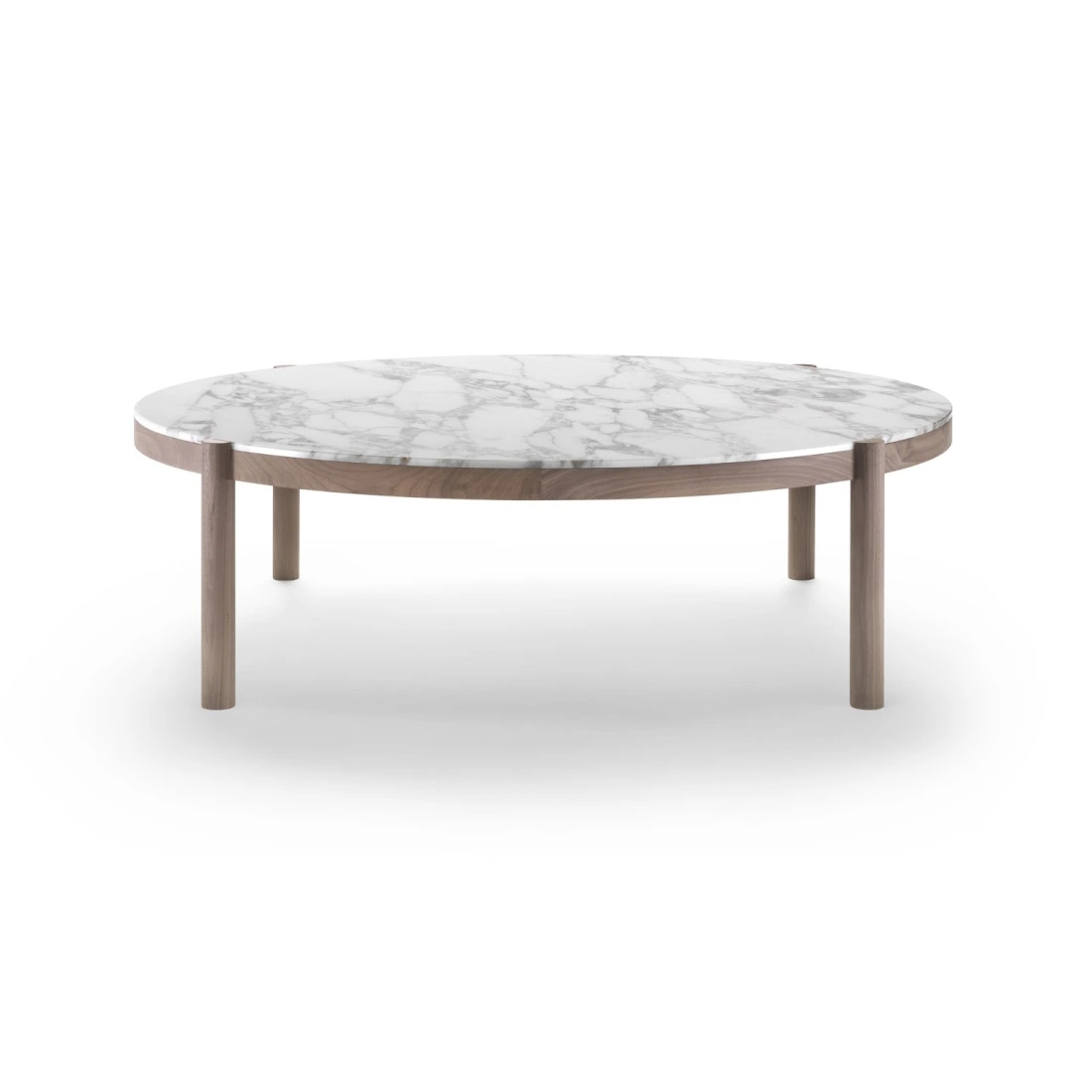 Defined by its sculptural form and quiet precision, the Gustav marble coffee table by Flexform explores the tension between material weight and visual lightness. A slender solid wood frame—crafted in Canaletto walnut or ash and finished in a curated range of stains—appears to cradle the marble surface, which sits perfectly flush within the timber structure.
