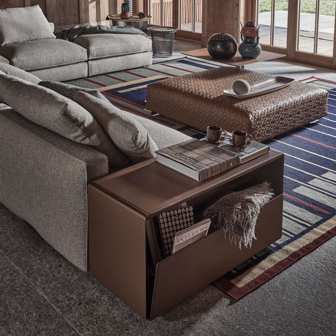 The magazine caddy armrest is metal, clad in cowhide, available in a range of luxurious colours: grey (5003), dark brown (5004), extra dark brown (5013), black (5005), olive (5006), Russian red (5008), sand (5001), tobacco (5015), dark brown suede (6004), black suede (6005), olive suede (6003), and sand suede (6001).