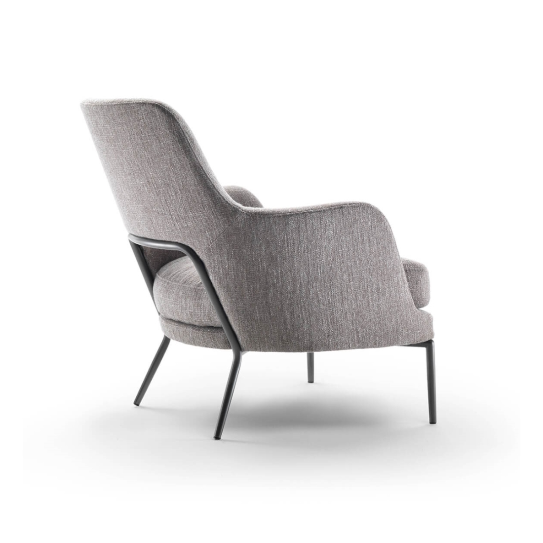 Balancing sculptural grace with architectural clarity, the Joyce armchair by Flexform explores the interplay between metal, form, and tradition. A curved backrest flows into gently flared armrests, supported by a visible metal structure that wraps around the seat like a minimalist frame—subtle yet purposeful in its presence.