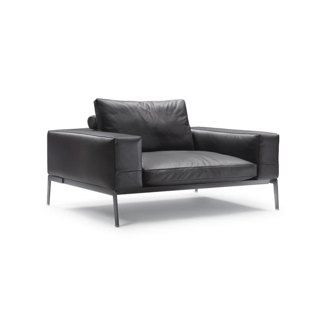 Designed for comfort, the seat cushion is filled with goose down and reinforced by a crushproof core, while the back cushion features a Dacron-padded bolster. The frame is clad in luxurious cowhide leather, accented with grosgrain piping. The Lifesteel armchair blends structural clarity with exceptional comfort, making it an ideal choice for modern living spaces.