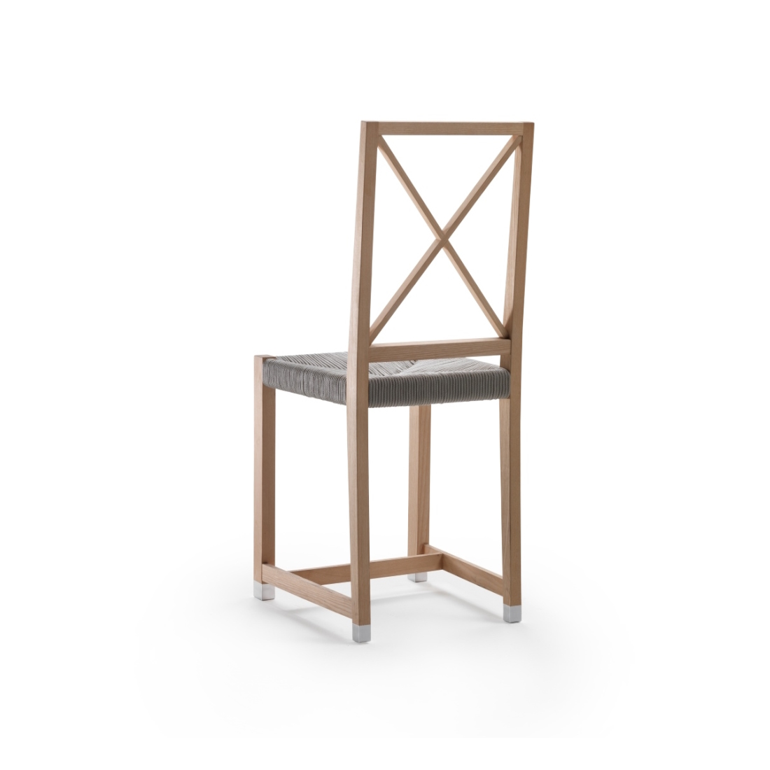 The structure is crafted from solid iroko wood, available in a natural finish, stained grey, or lacquered white. The seat is woven from extruded PVC with a nylon core, and comes in a range of colours like anthracite, bordeaux, white, cream, brown and green; or alternatively, in polypropylene cord in shades such as sand, anthracite, bordeaux, green, white, and brown. The leg tips are made of die-cast zama with either a matt brushed or burnished finish and rest on thermoplastic pads for longevity. An optional waterproof cover is also available.