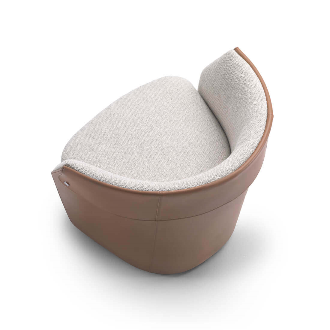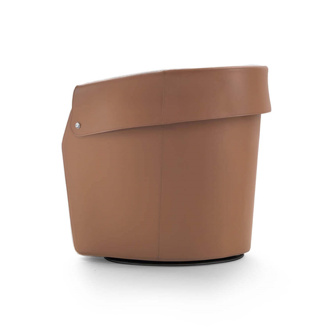 Compact in scale but rich in character, the Ozzy armchair by Flexform brings sculptural refinement to versatile living spaces. Designed with a nomadic spirit, its silhouette is defined by a cowhide-clad outer shell that contrasts elegantly with the softness of its upholstered seat—available in leather or fabric. A discreet metal swivel base grounds the piece with quiet precision.