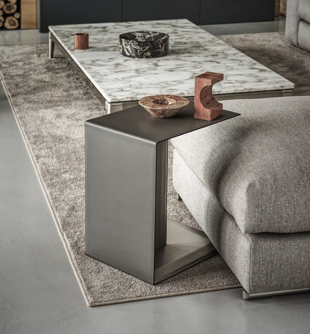 Defined by its architectural C-shaped form, the Plain side table by Flexform is a sculptural piece designed to nest beside seating with discreet utility. Its slender profile slides effortlessly beneath sofas or chaises, offering a tactile surface for books, trays, or personal items.