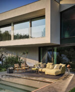 With a modular structure and a graphic woven frame, the Vulcano outdoor modular sofa by Flexform brings sculptural presence to contemporary terraces and garden lounges. The base in marine plywood supports a frame in austenitic stainless steel 316, hand-wrapped in polypropylene fibre or polyurethane rubber for tactile contrast and visual rhythm.