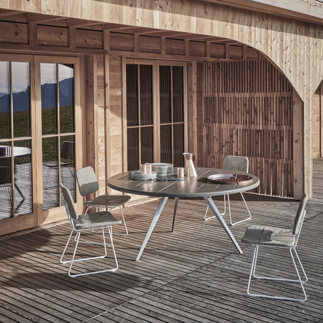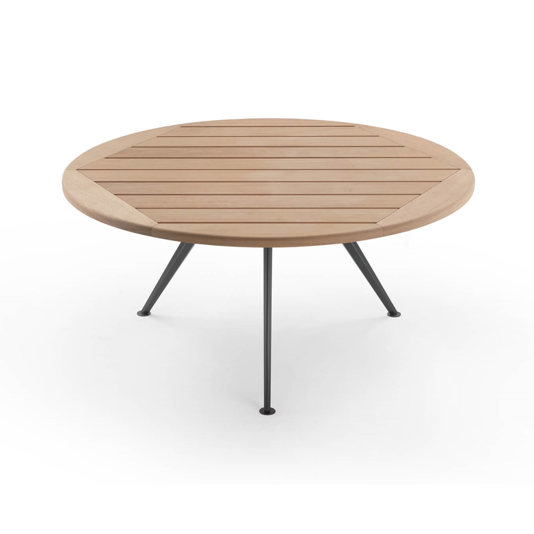 A slatted tabletop in solid iroko wood lends natural warmth, chosen for its durability and ability to weather beautifully over time. The contrast between metal and timber defines the table’s quiet strength. Designed for al fresco entertaining, Zefiro is a sculptural yet grounded centrepiece that brings material clarity to luxury outdoor dining environments.