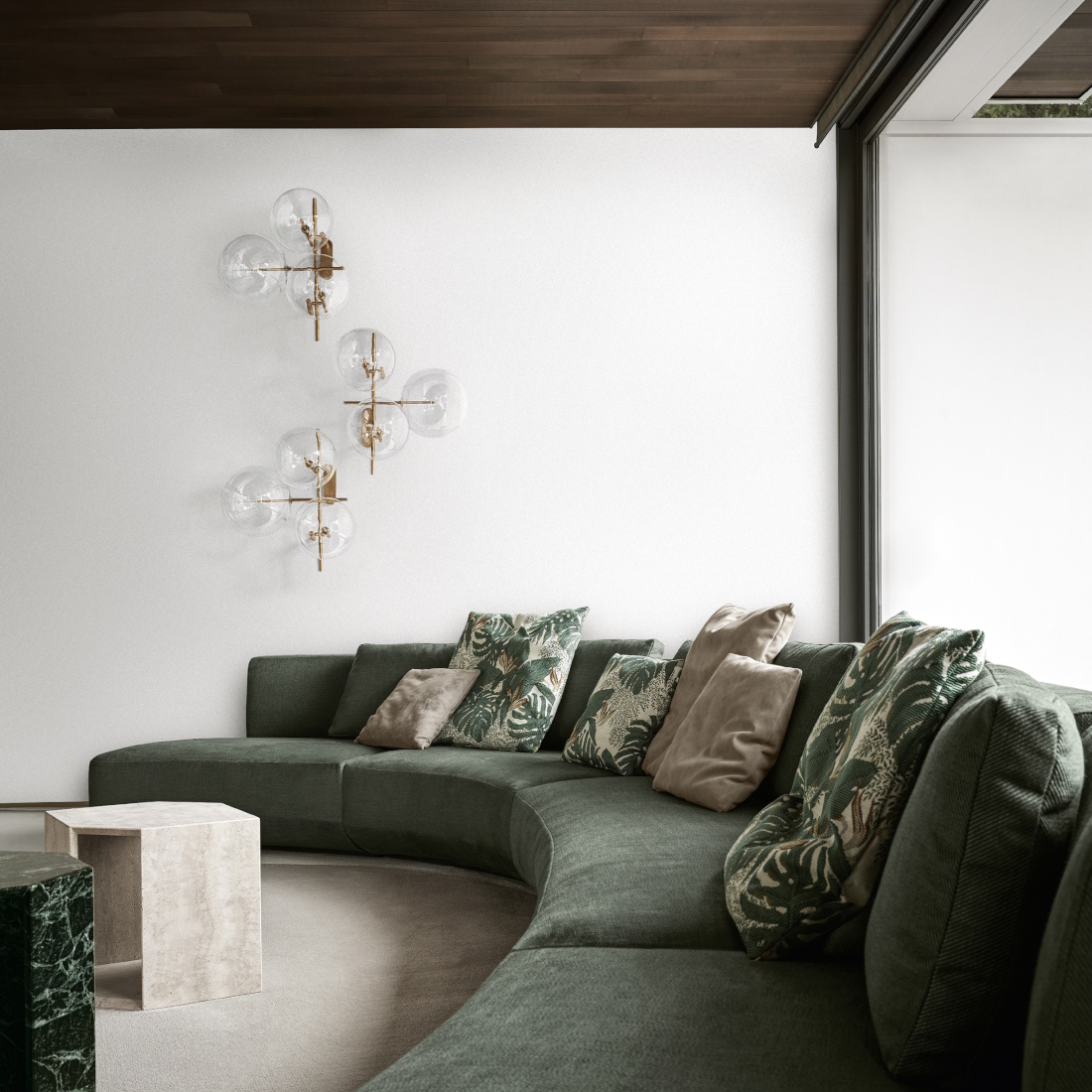Designed by Massimo Castagna, each globe is mouth-blown by artisans in Murano-inspired techniques, with finishes offered in transparent, topaz, amber, amethyst, or bronzite. The backplate is hand-burnished to achieve natural tonal variation, giving each piece a subtly unique patina. With its blend of geometry, glow, and material nuance, Bolle Aria redefines sculptural lighting.