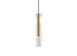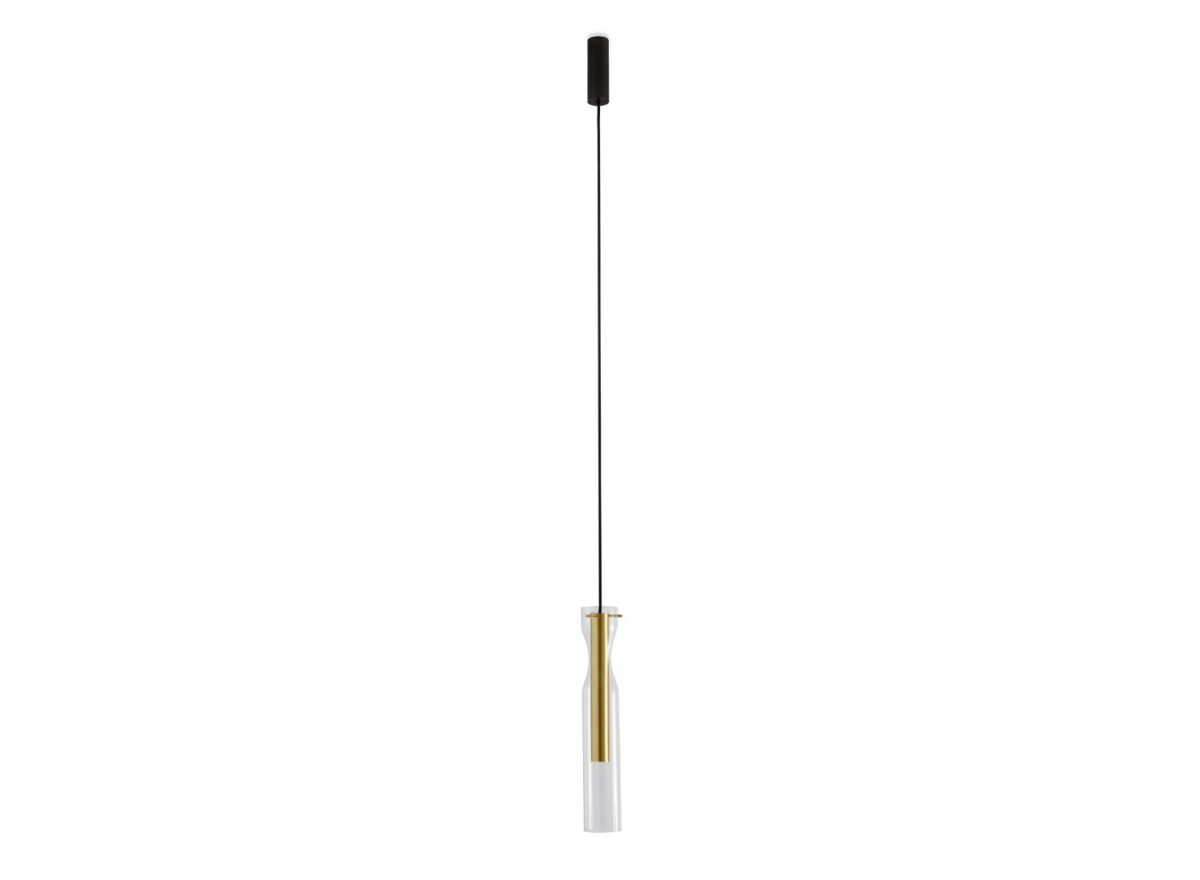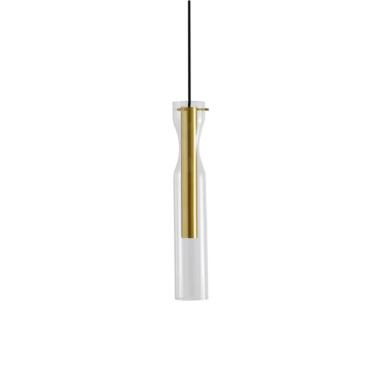 The pendant features hand-shaped transparent glass cylinders, complemented by metal parts available in bright, satin, hand-burnished, black chromed, or coppered brass finishes.