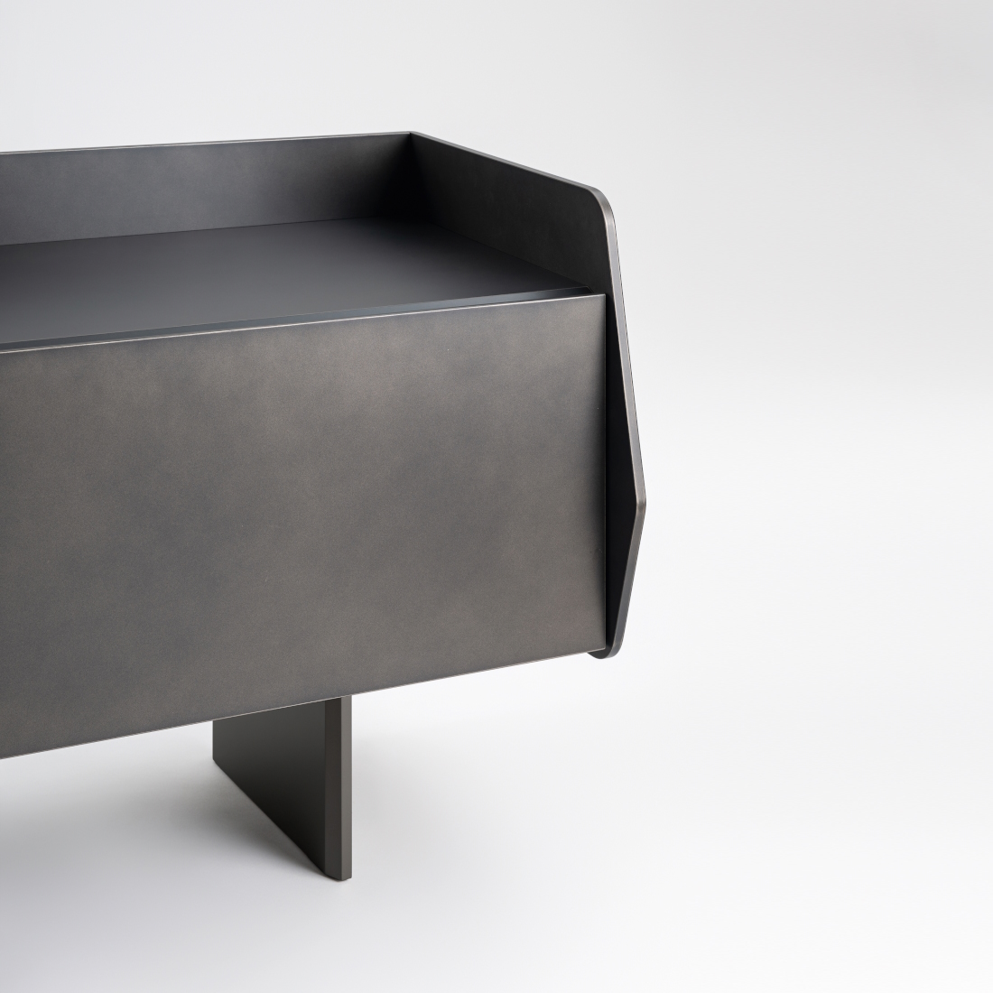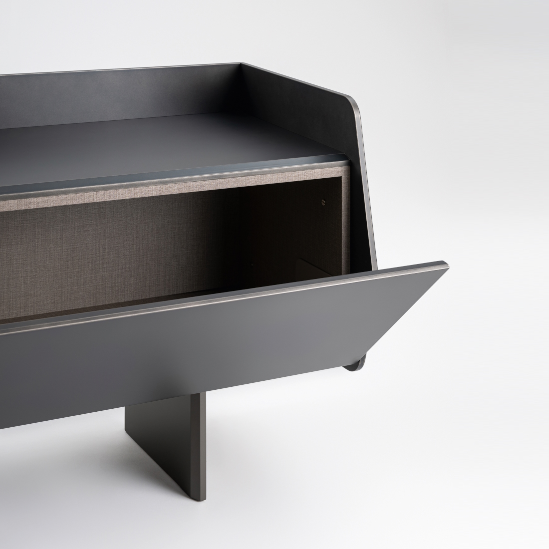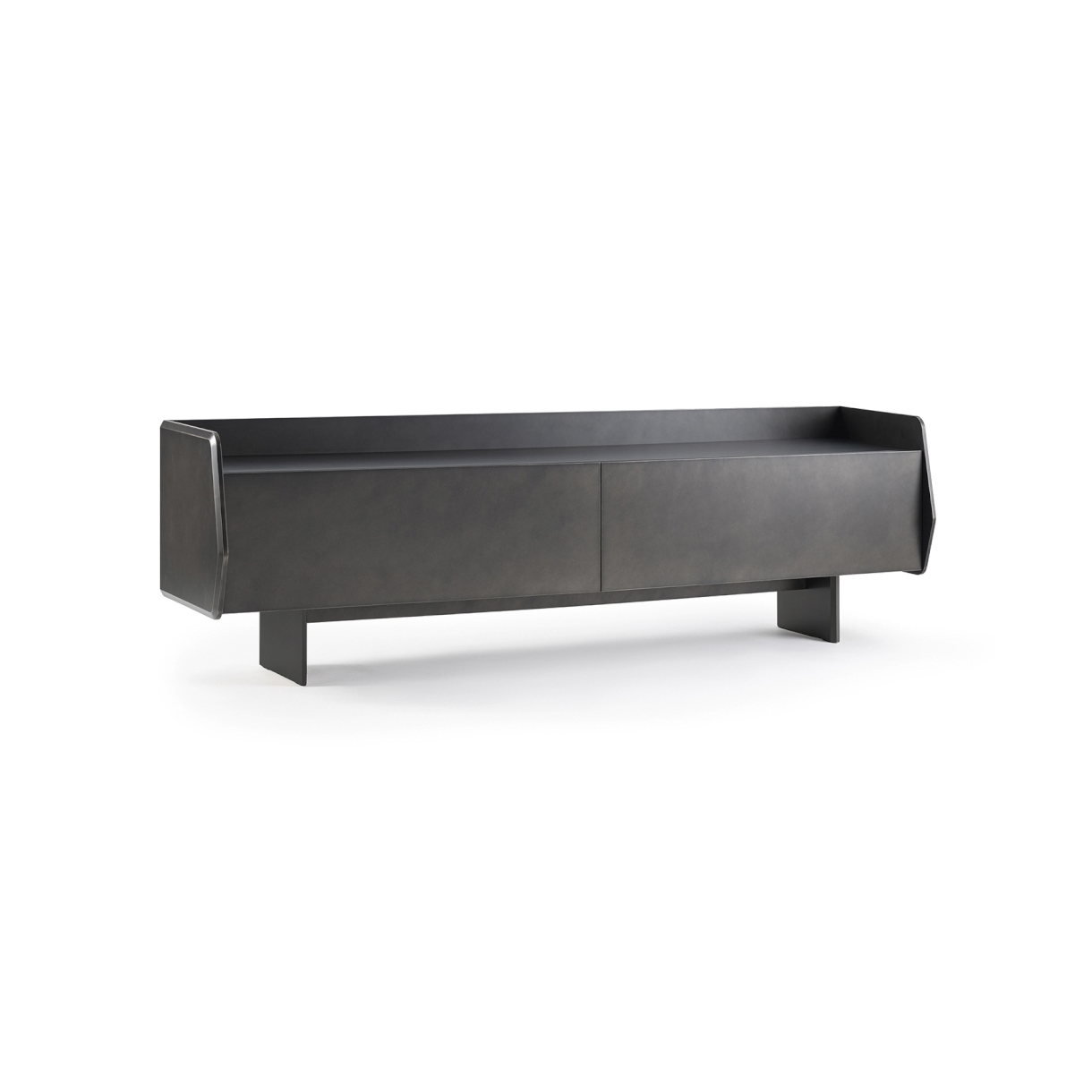 The linear volume introduces a measured horizontal datum within the room, the Gastone sideboard by Carlo Colombo establishing quiet order in architect-designed living spaces and circulation zones. Its clean façade, articulated by two flap doors, reads as a single continuous plane finished in an exclusive lead-painted treatment that anchors the piece with controlled visual weight.