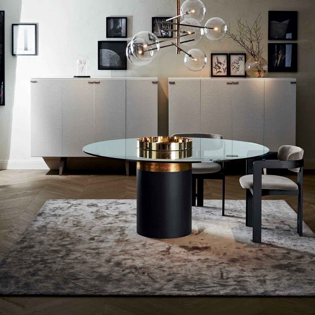 A study in balance and refinement, the Haumea-T dining table by Gallotti&Radice elevates architectural simplicity into sculptural form. Its 15 mm tempered glass top—available in smoked or extra-clear finishes—rests weightlessly above a tiered pedestal base, offering visual lightness with structural clarity.