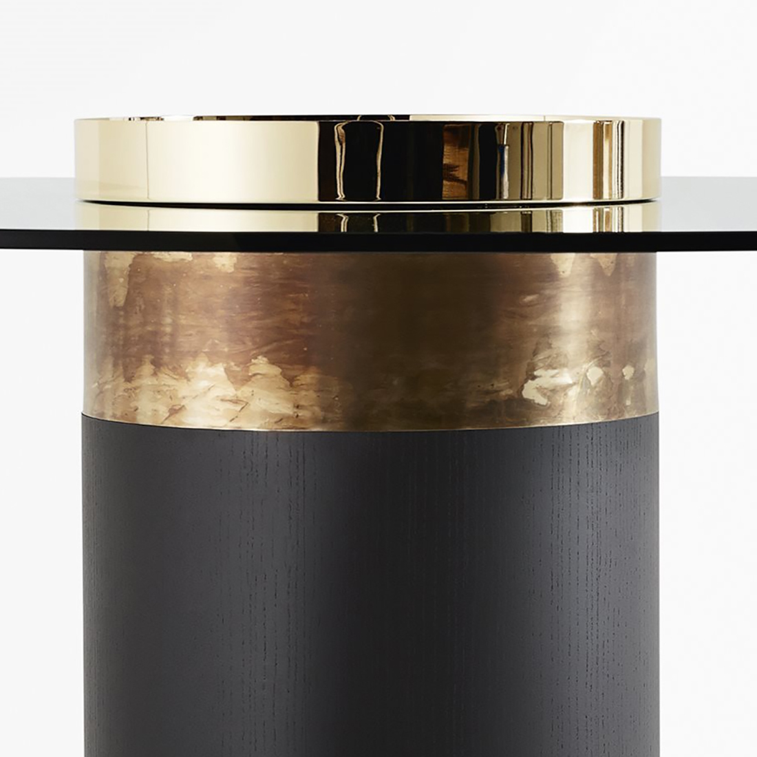 The base is available in black or white open-pore stained ash or rust lacquered wood, with a central cylinder in bright brass-plated or black chromed metal.