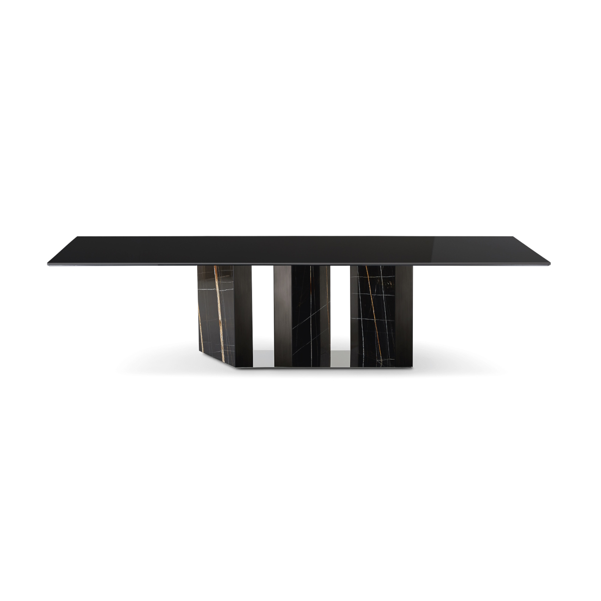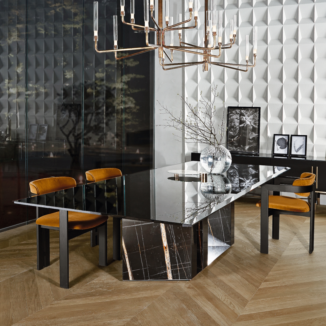 Composed as intersecting planes and reflective geometry, the Platium dining table by Gallotti&Radice grounds the interior with architectural gravity. Three angled columns form the base—either in Sahara Noir marble or lacquered glass—each anchored by a circular plate in polished supermirror steel. The silhouette reads as sculptural infrastructure, drawing light and attention in penthouse dining zones or open-plan residences.