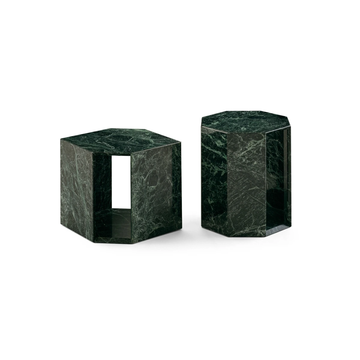 Designed by David/Nicolas, each table is carved from solid Travertine or Verde Alpi marble, revealing intricate veining and surface depth. No two pieces are identical. The honed finish enhances tactile richness, while weight and geometry ensure permanence. These are not accents, but architectural elements in stone.