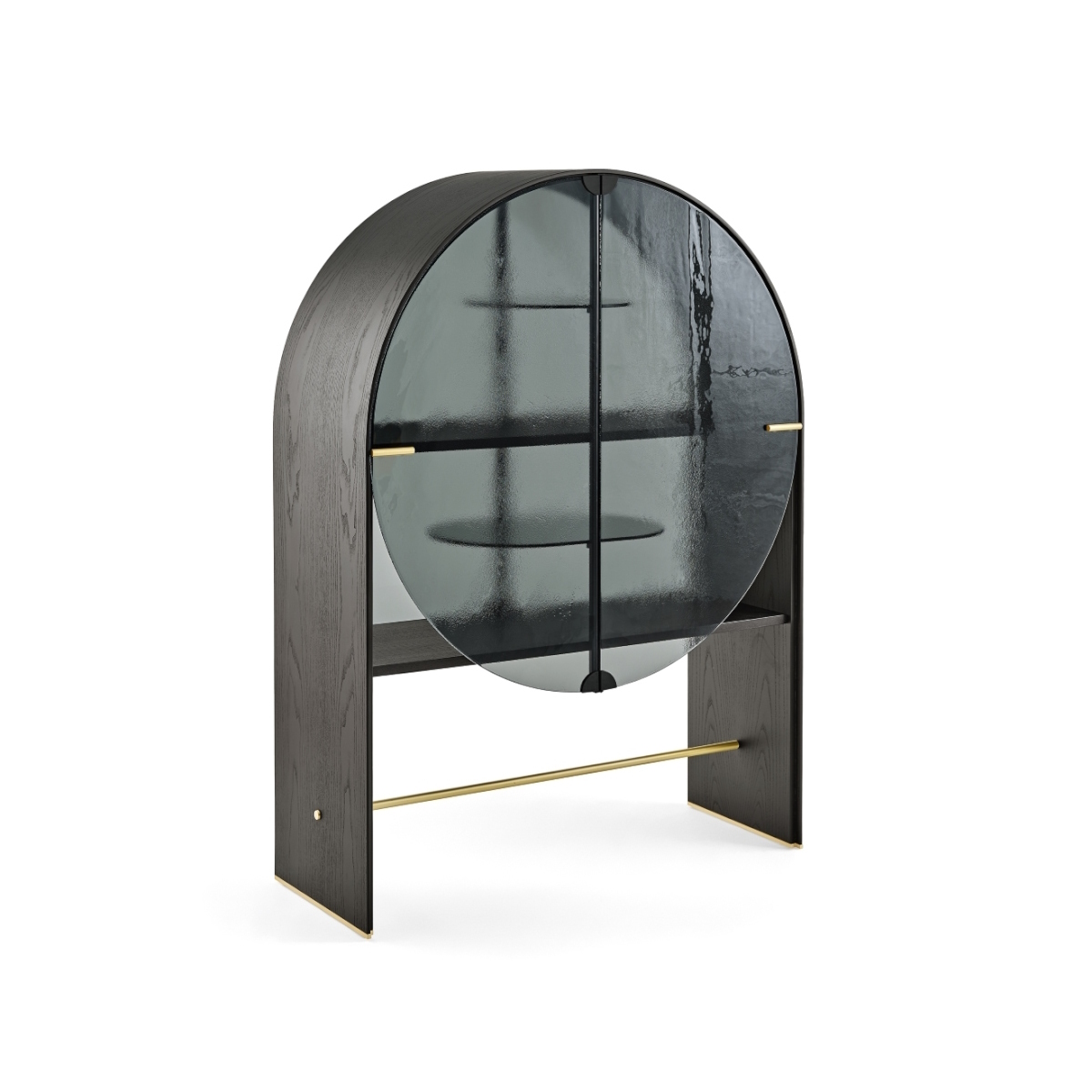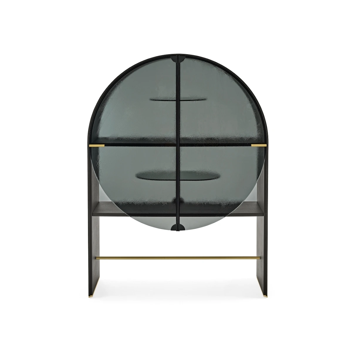 Created by Draga & Aurel, the cabinet features smoked “Grigio Italia” tempered glass shelves, selected for tonal coordination and structural clarity. Every element is unified through glass-on-glass construction, enhancing surface luminosity and material cohesion. The result is a storage piece with sculptural gravity and contemporary Italian refinement.