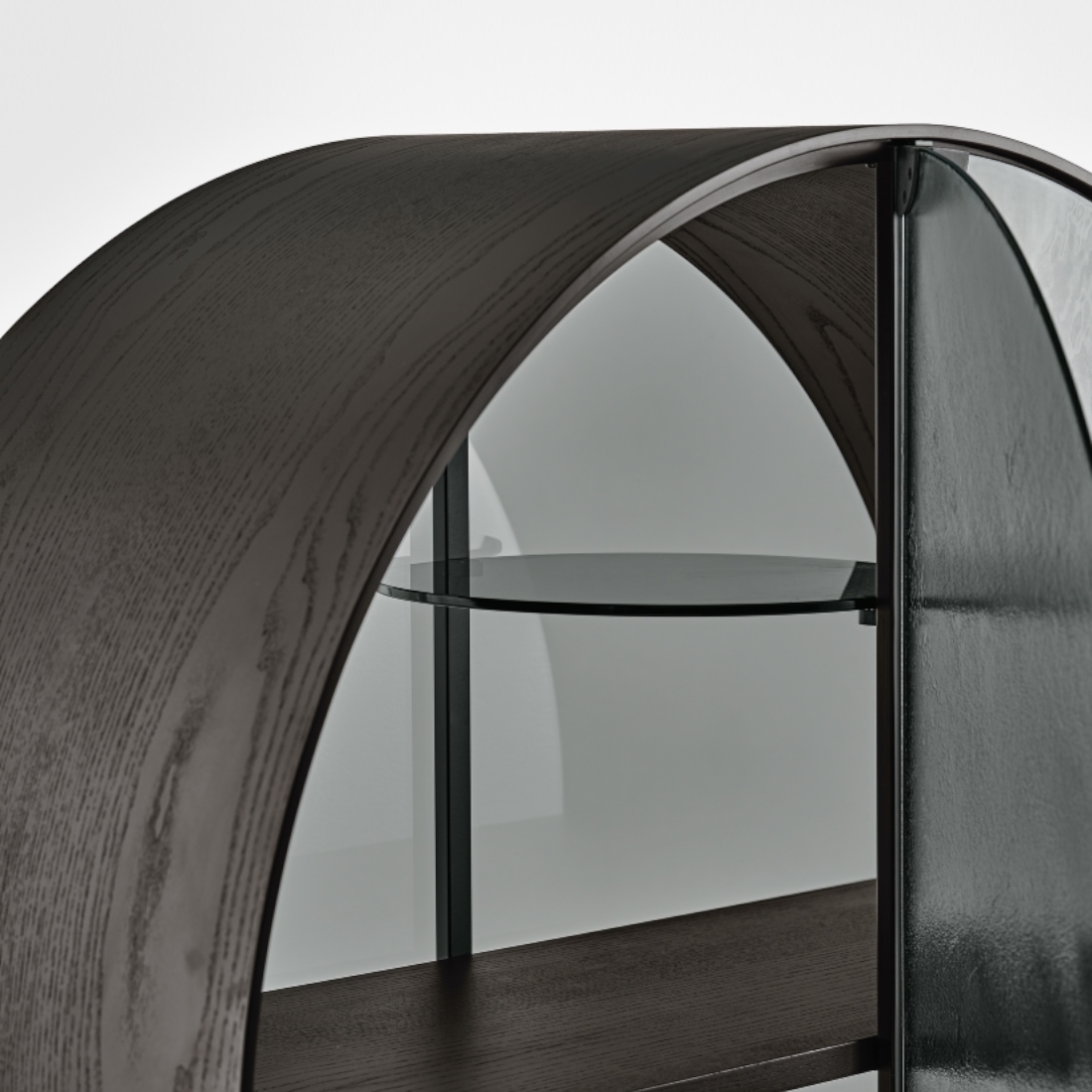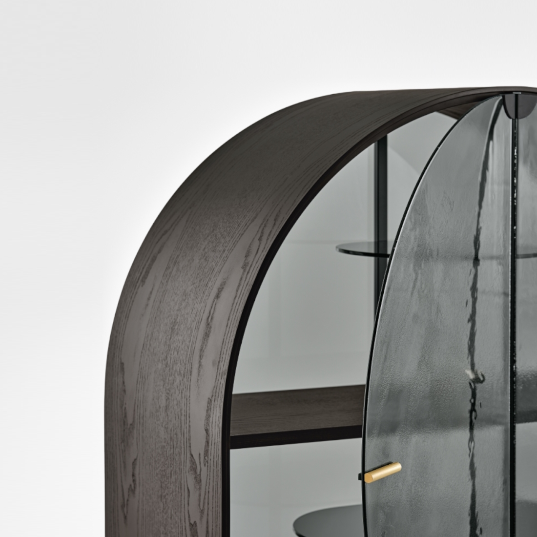 The interior features back panels and shelves in 6 mm tempered smoked “Grigio Italia” glass, offering a refined and cohesive interior.