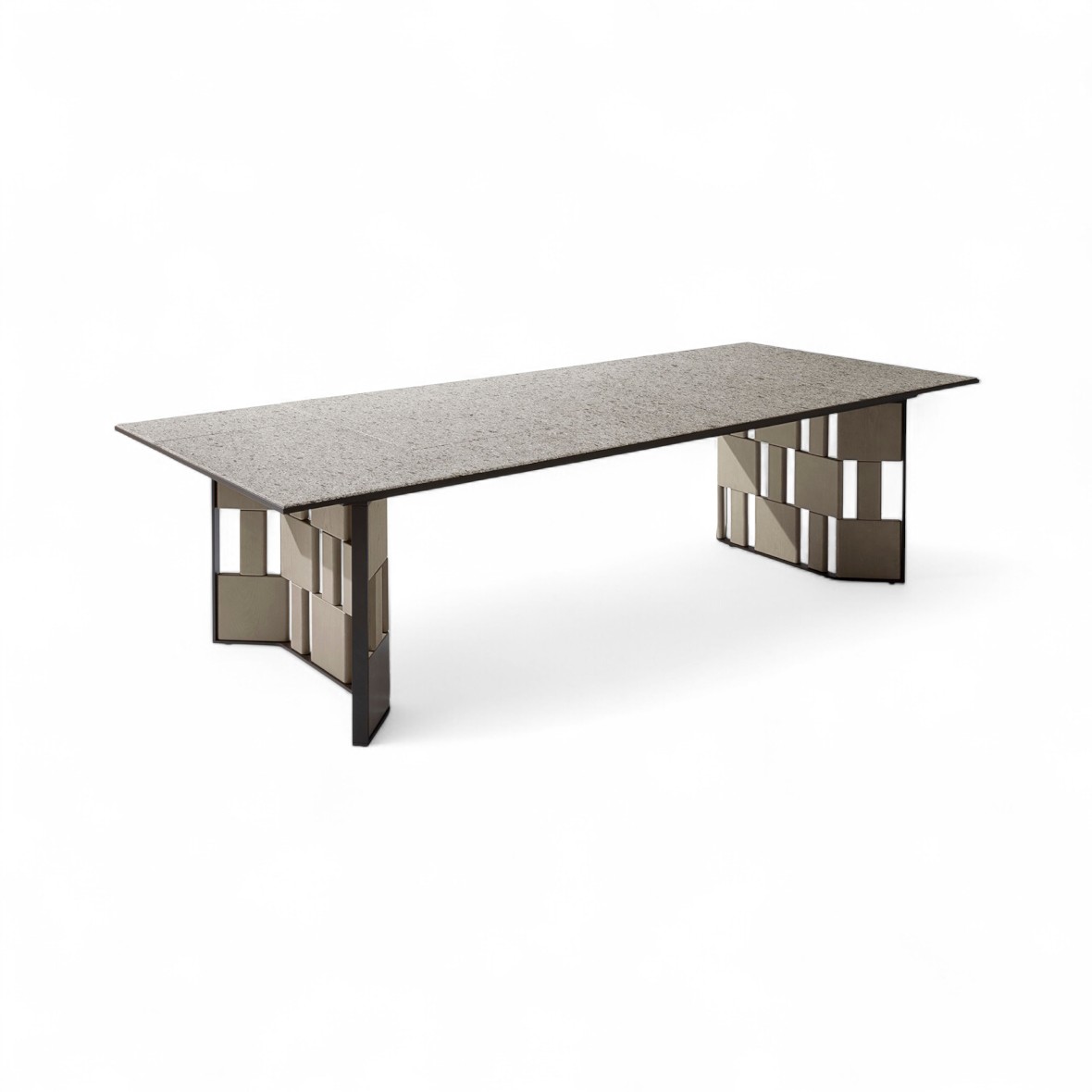 A play of raw texture and clean geometry, the Giorgetti Break outdoor dining table—designed by Ludovica + Roberto Palomba—anchors open-air spaces with quiet force. Its rectangular surface is punctuated by inlaid Etna lava stone, rich with natural fissures and mineral tone, framed by an aluminium and stainless steel structure finished in carob powder coating.
