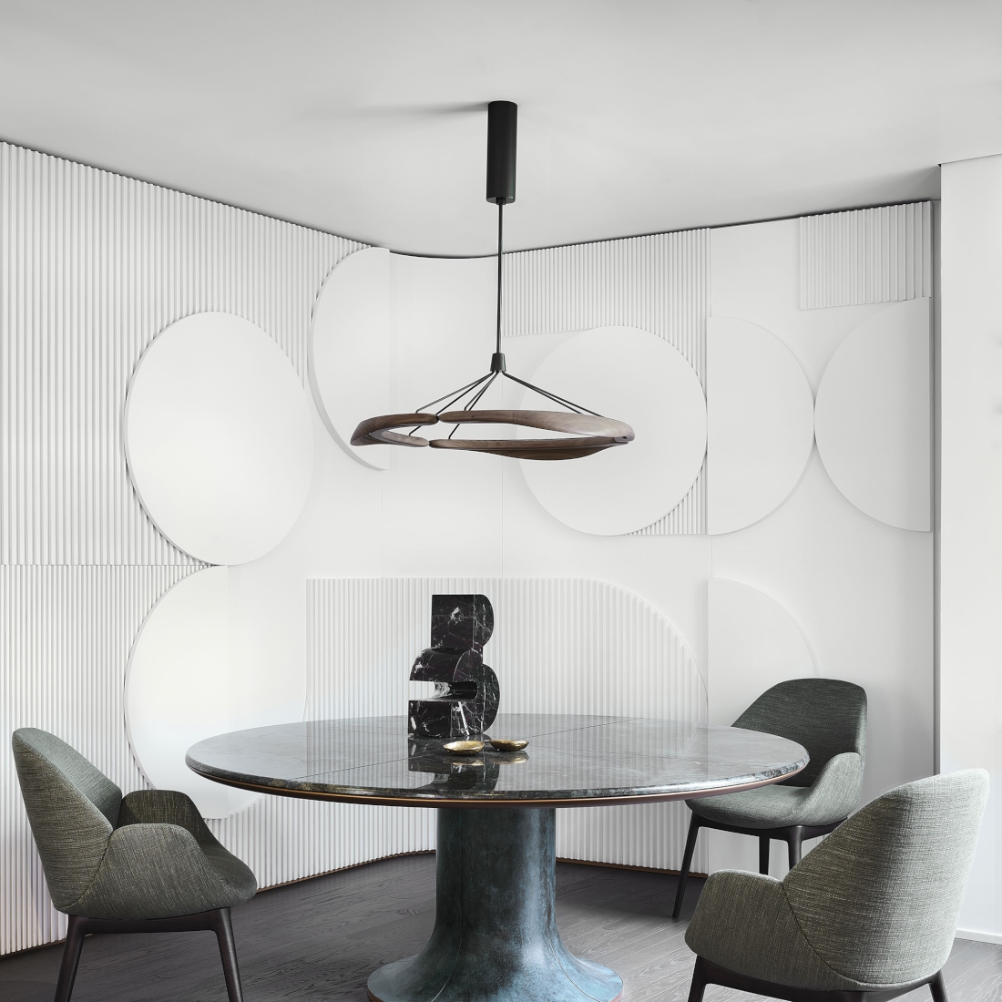 Crafted in natural, grey, or dark-stained walnut, each segment is finished with architectural precision, honouring Giorgetti’s woodworking legacy in a contemporary lighting context. A luxury wooden chandelier that bridges eras, Dunes is ideal for gallery-like dining rooms, double-height living spaces, or penthouse settings with design lineage.