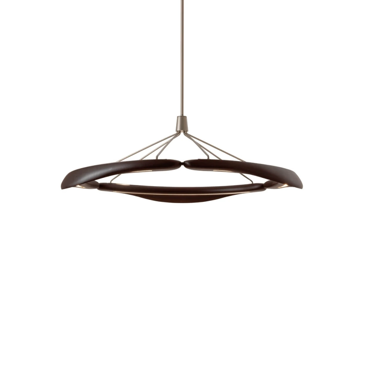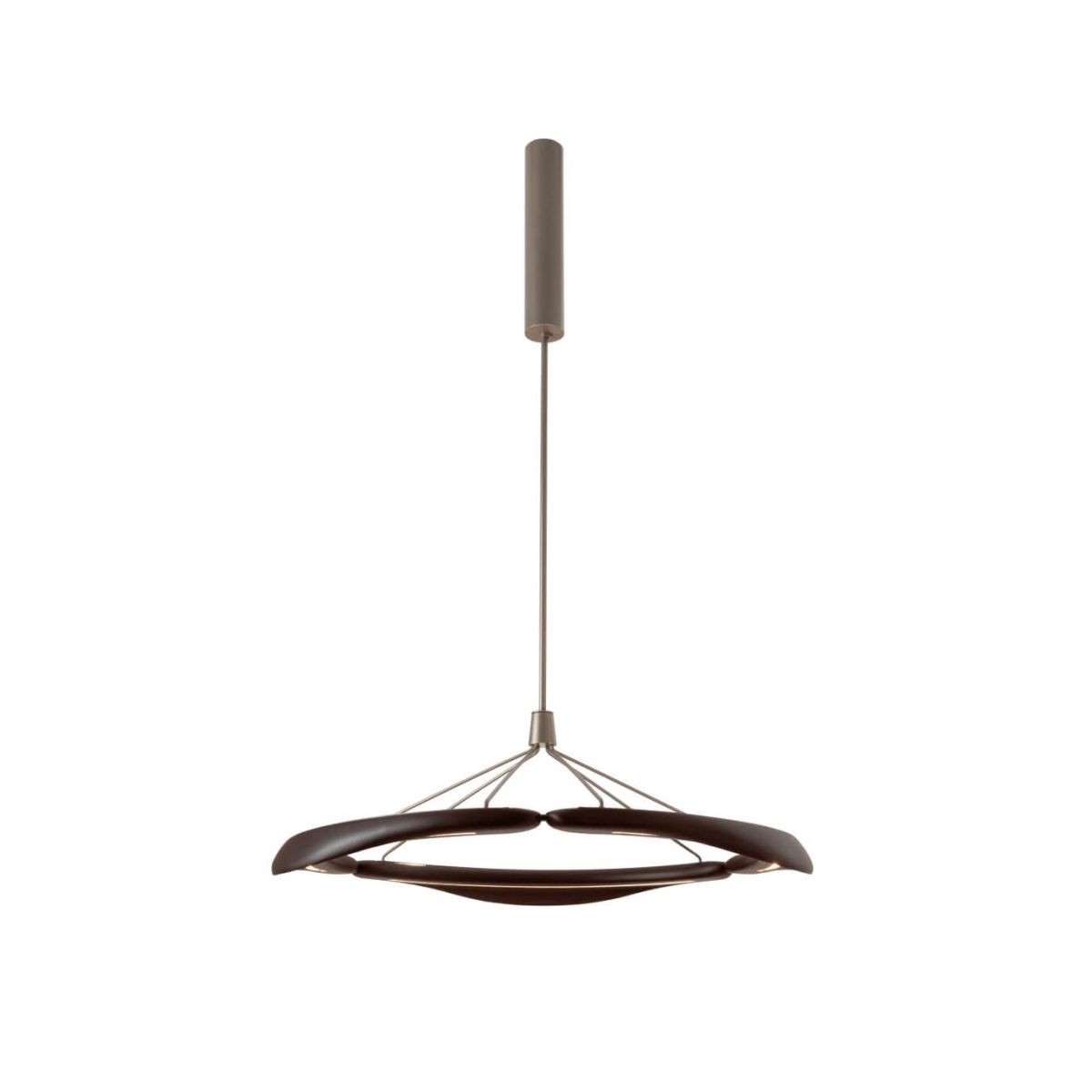Curved like a mid-century gesture in slow motion, the Giorgetti Dunes chandelier draws its form from 1950s Italian design—translating geometry into floating arcs of Canaletto walnut. Suspended from a pewter-painted metal frame, its sculptural silhouette glows from within, as integrated LED strips diffuse a soft ambient light across the timber’s grain.