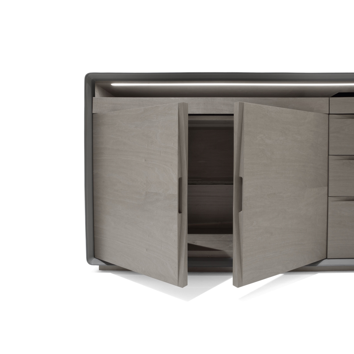 Handcrafted in Italy, the cabinet features a dove-grey maple structure with lateral profiles in Tobacco saddle leather and Zebrino marble detailing. Internal sycamore drawers and crystal shelving combine functional precision with visual depth, enhanced by integrated motion-sensor LED lighting. A designer wooden cabinet of material fluency and composed restraint, crafted for enduring refinement.