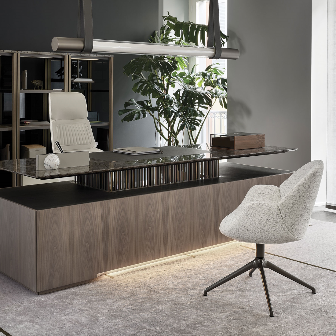 A sweeping arc of Canaletto walnut defines the Giorgetti G-Code desk, designed by Dante Bonuccelli as a sculptural anchor for executive spaces. The wraparound worktop—encased in saddle-stitched leather—extends into a cantilevered drawer, balancing visual lightness with grounded volume. Every line reflects architectural control, where form and utility converge with precision.