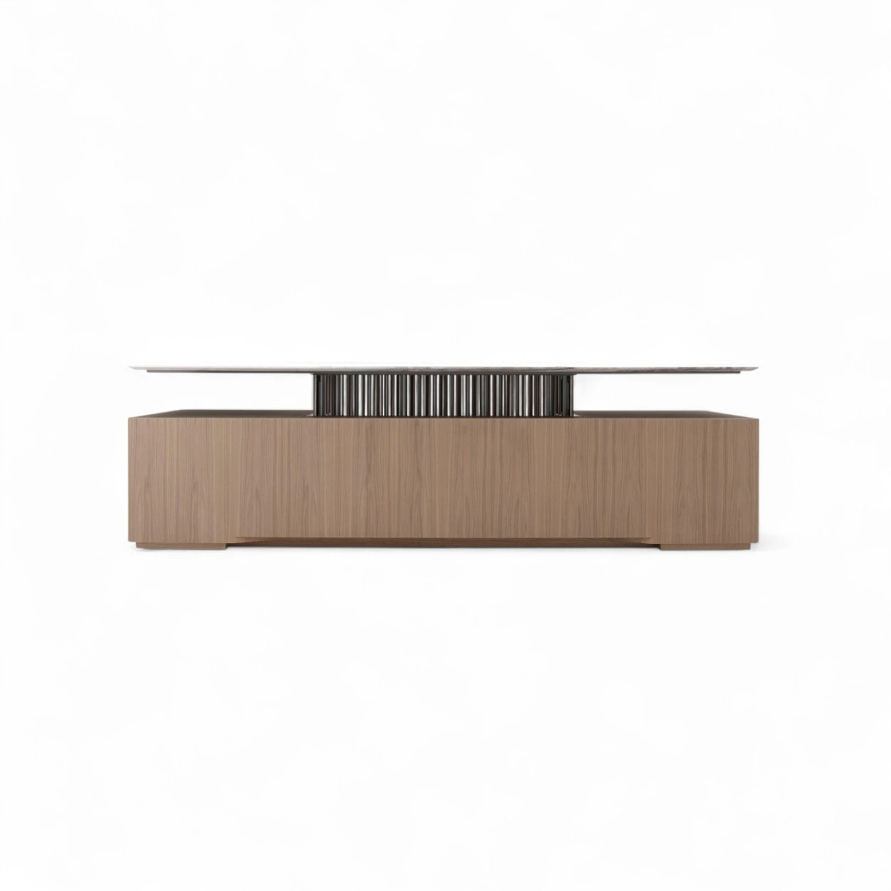 The front features a courtesy compartment illuminated by a dimmable LED strip, enhancing the desk’s elegant presence, with a remote control for convenient adjustment.