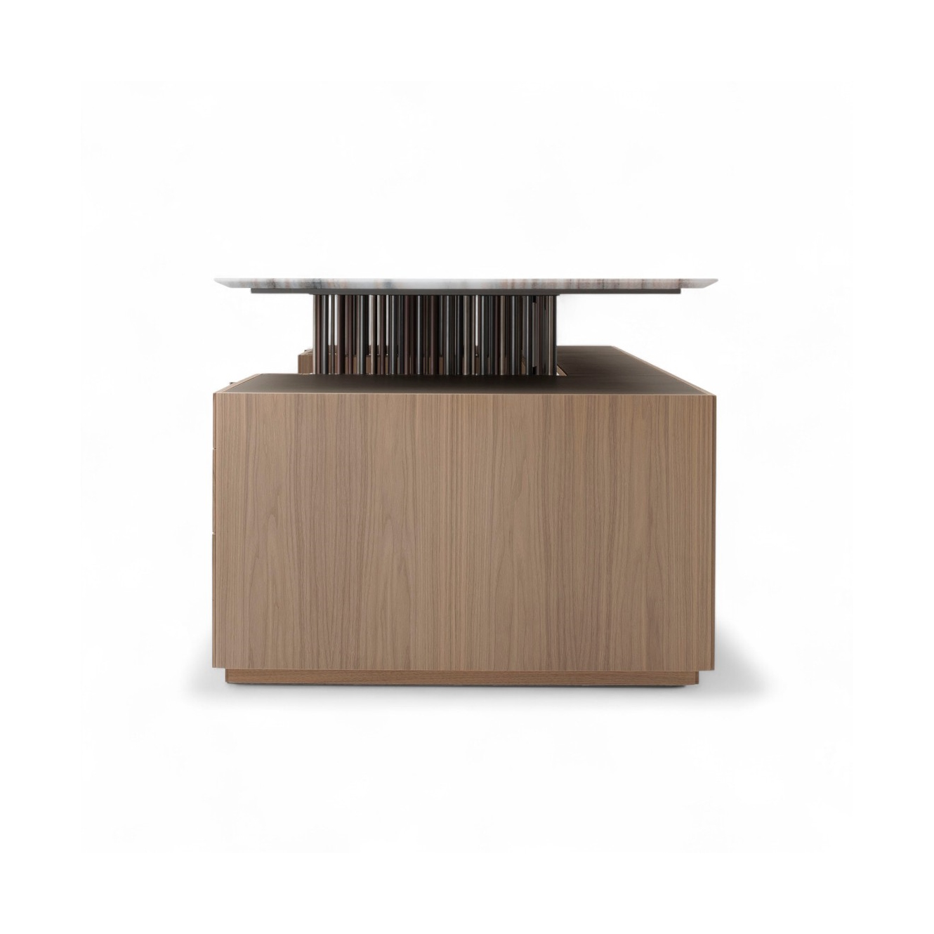 The top can be finished in a selection of marbles, including Calacatta, Calacatta Violet, Abstract Grey, Zebrino, or Portoro, or walnut in the same finish as the structure, complete with a refined leather insert.