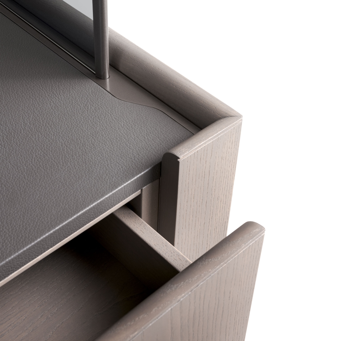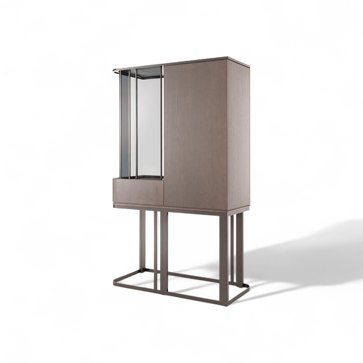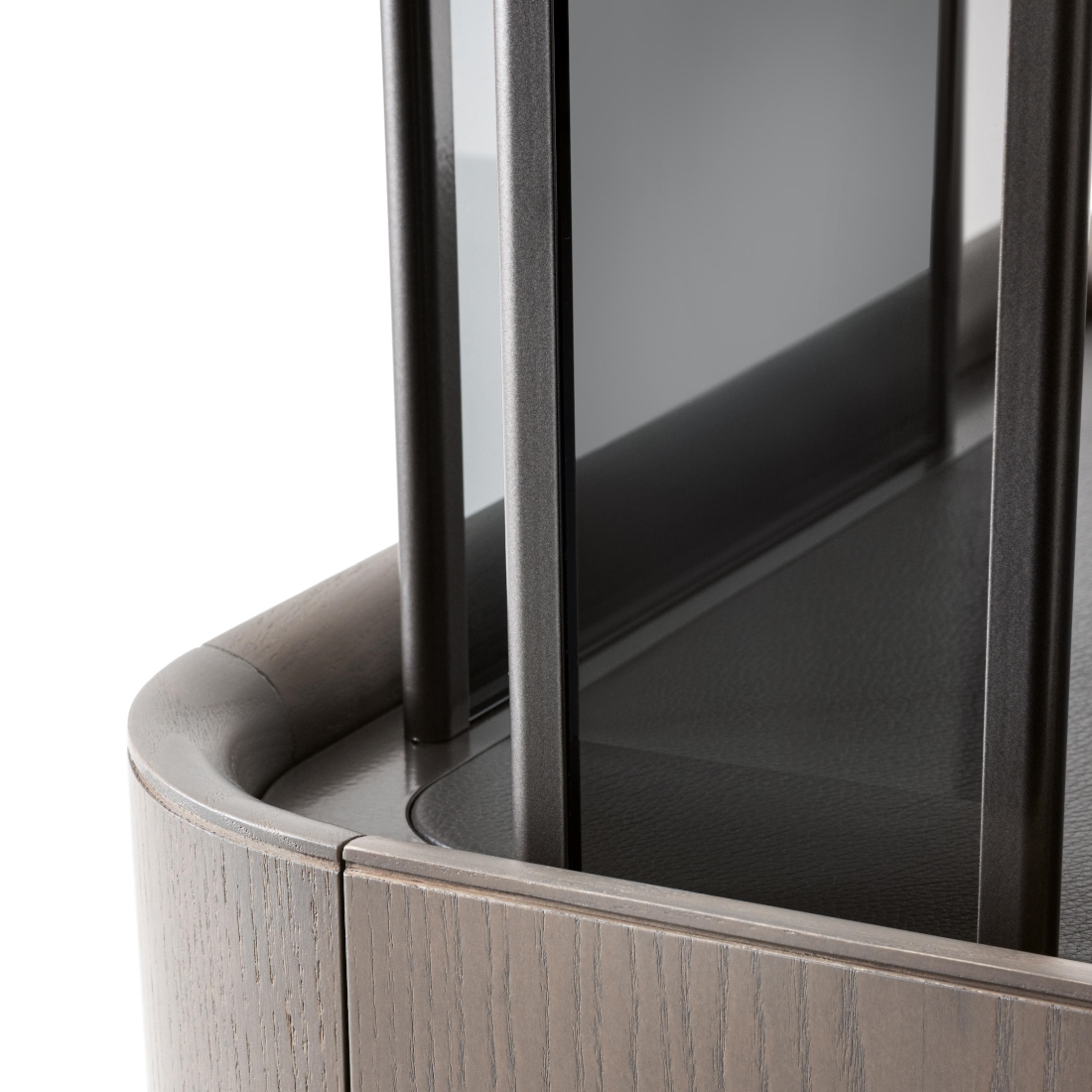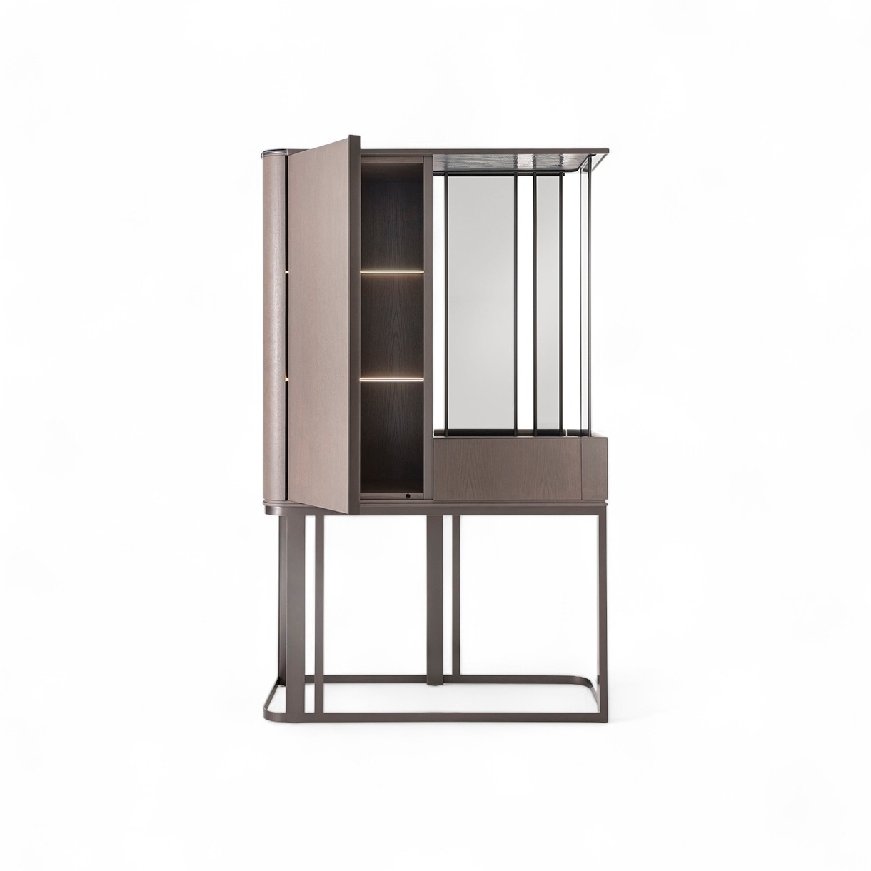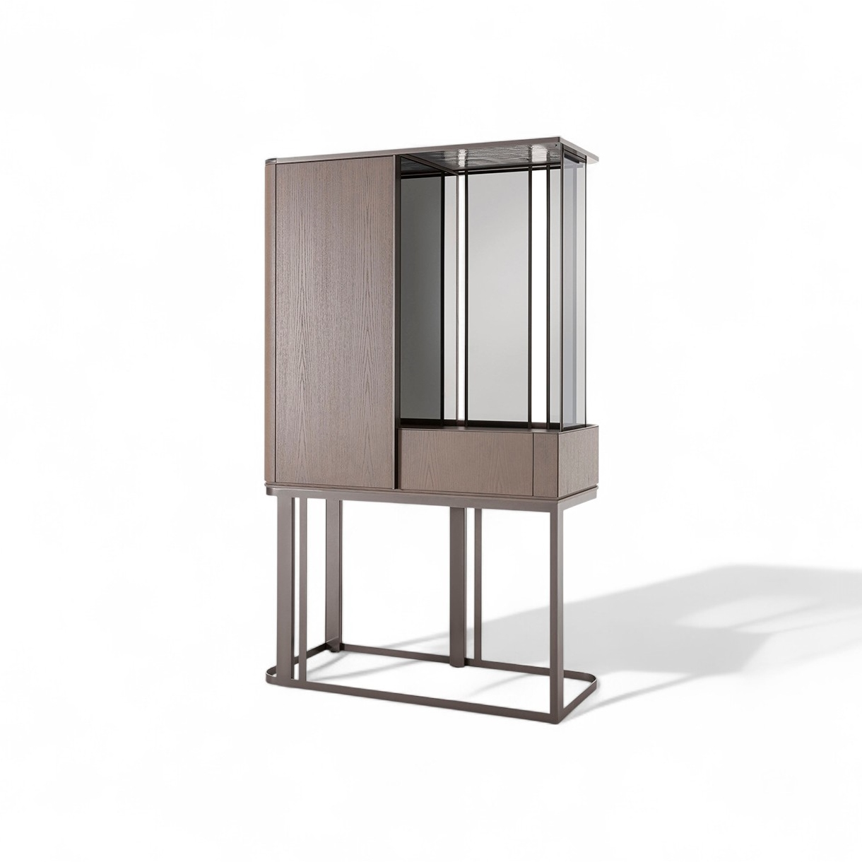 Right compartment houses a practical drawer and open display area, featuring a leather-lined base in Plus Pelle colours. Framed by smoked glass side panels and backed by a smoked mirror, the composition adds visual depth and contemporary elegance.