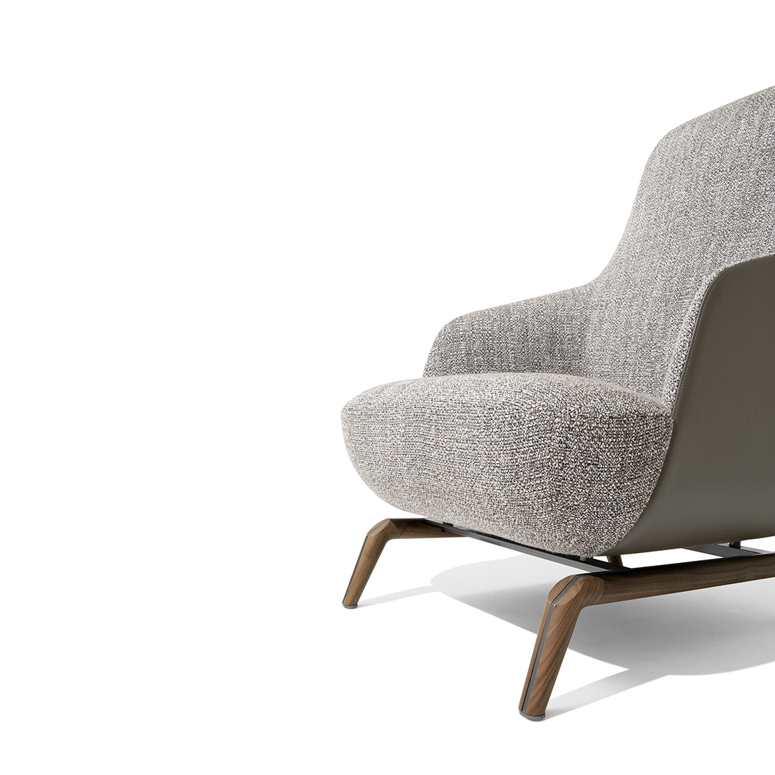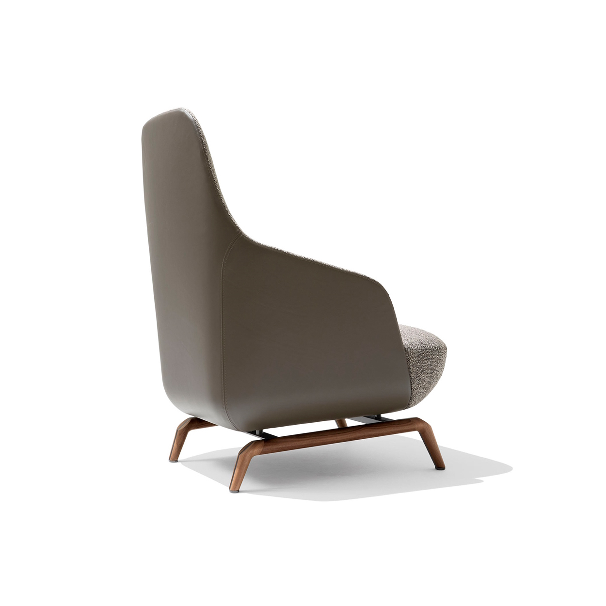 Handcrafted in Italy, the exterior is upholstered in luxurious leather, while the seat features San Diego fabric—a wool blend distinguished by its nuanced interplay of light and shadow. The base, in pewter-finished metal with natural Canaletto walnut profiles, anchors the form with refined contrast. A designer armchair of material fluency and compositional grace.