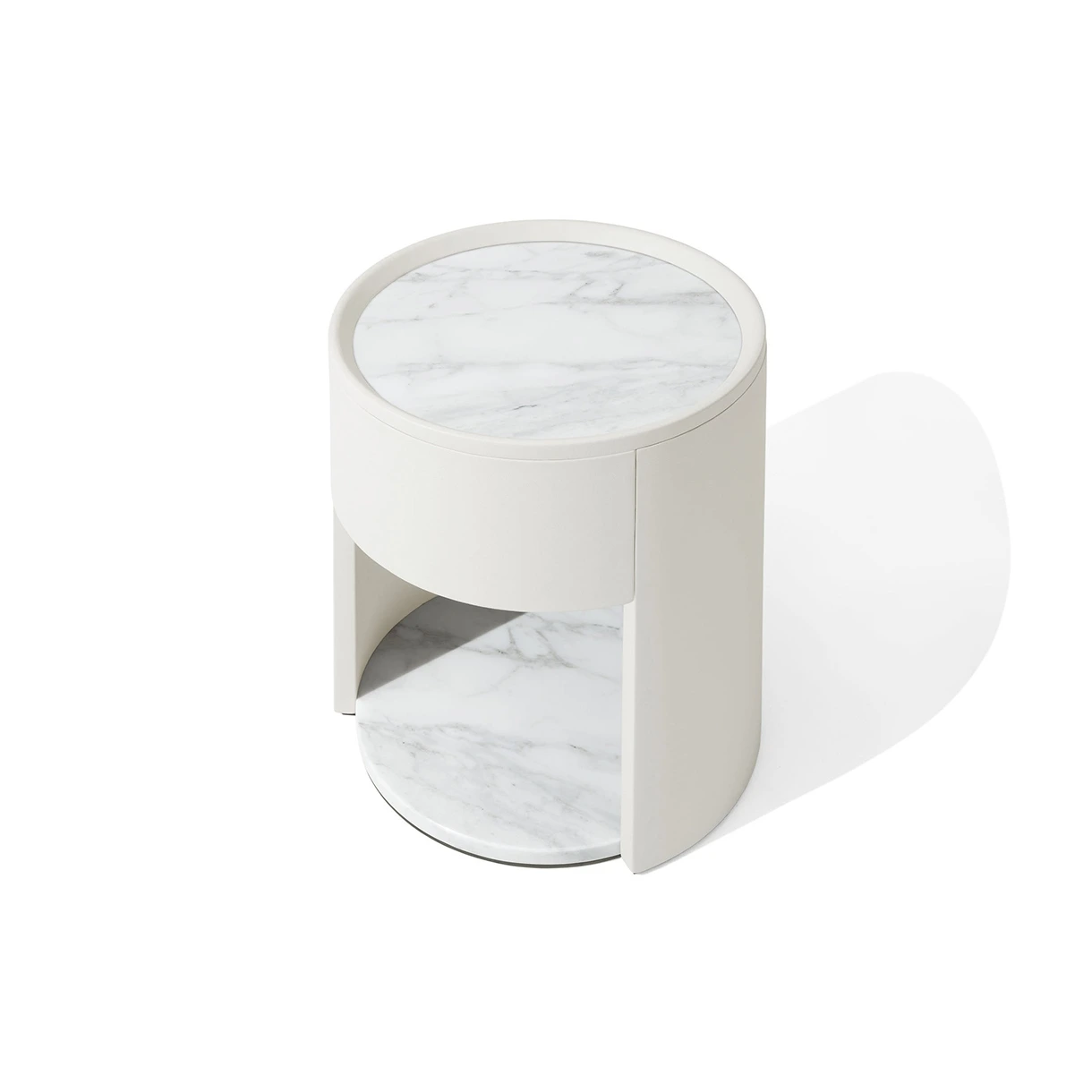 Handcrafted in Italy, the curved plywood frame is wrapped in leather, paired with upper and lower tops in marble. Finishes include Calacatta, Zebrino, Portoro, Grigio Astratto and Calacatta Purple. A sycamore-lined drawer with leather front completes this designer bedside cabinet with tactility, nuance, and compositional clarity.