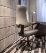 Armrest connection constructed in solid ash wood, available in four finishes: natural, anthracite grey, biscuit, and ash grey. Integrated with a specialised mechanism to ensure elasticity between backrest and armrest.