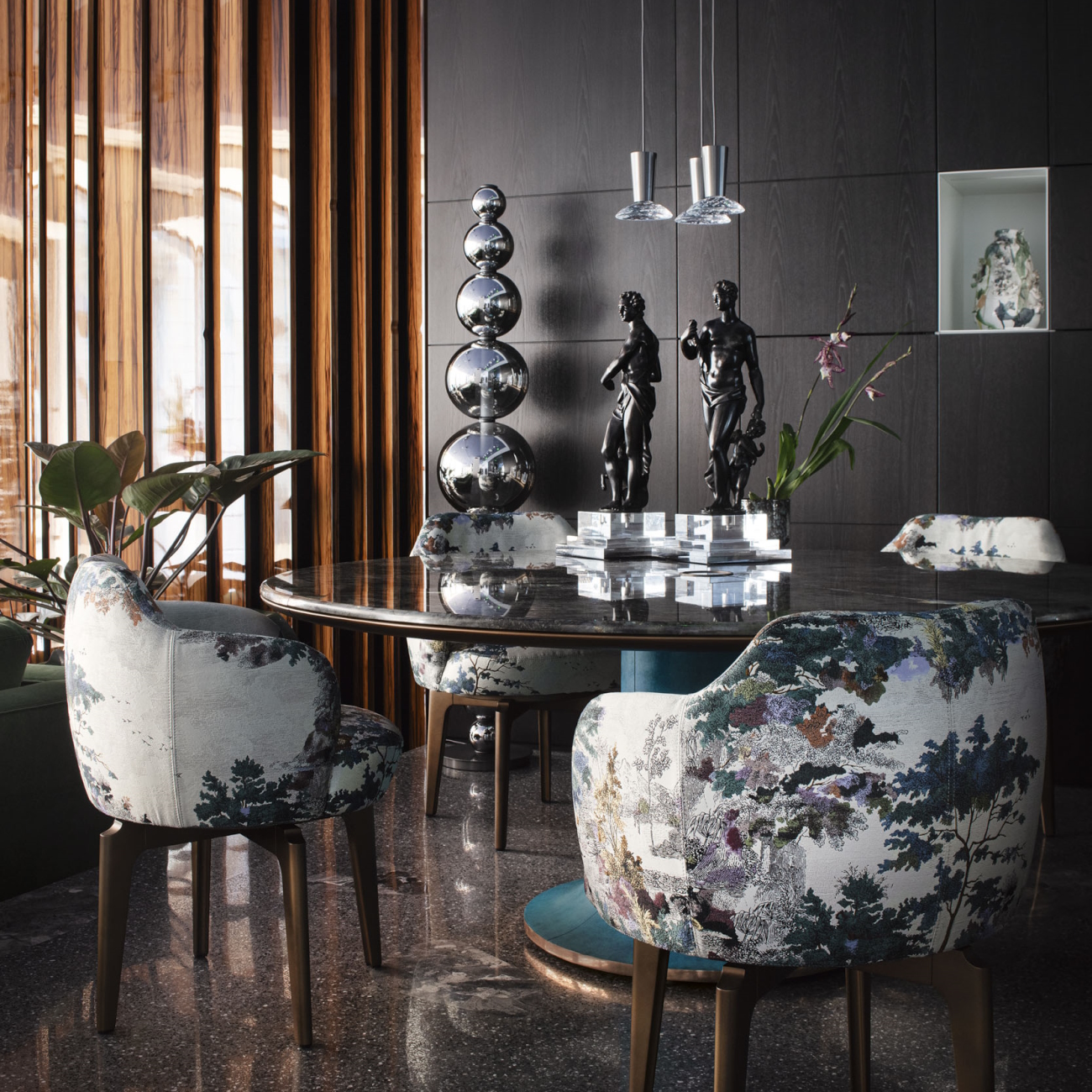 A vertical constellation of reflective spheres, the Upward floor lamp by Giorgetti introduces sculptural tension to contemporary interiors. Designed by Nava + Arosio Studio, its nine borosilicate glass globes—each in a titanium-hued PVD mirror finish—stack in a rising sequence, distorting the room by day and releasing a warm, atmospheric glow at dusk. The form reads as both object and intervention, engaging the surrounding space through reflection, light, and shifting perspective.