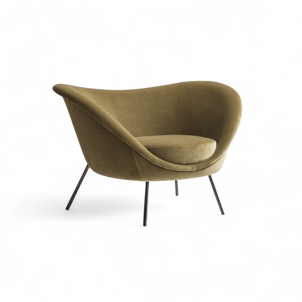 Reissued by Molteni&C as part of its Heritage Collection, the chair features a rigid polyurethane structure paired with a padded inner frame upholstered in curated velvet or textile options. Slender black chrome feet elevate the silhouette with visual lightness. A designer Italian armchair that unites mid-century form with contemporary material refinement.