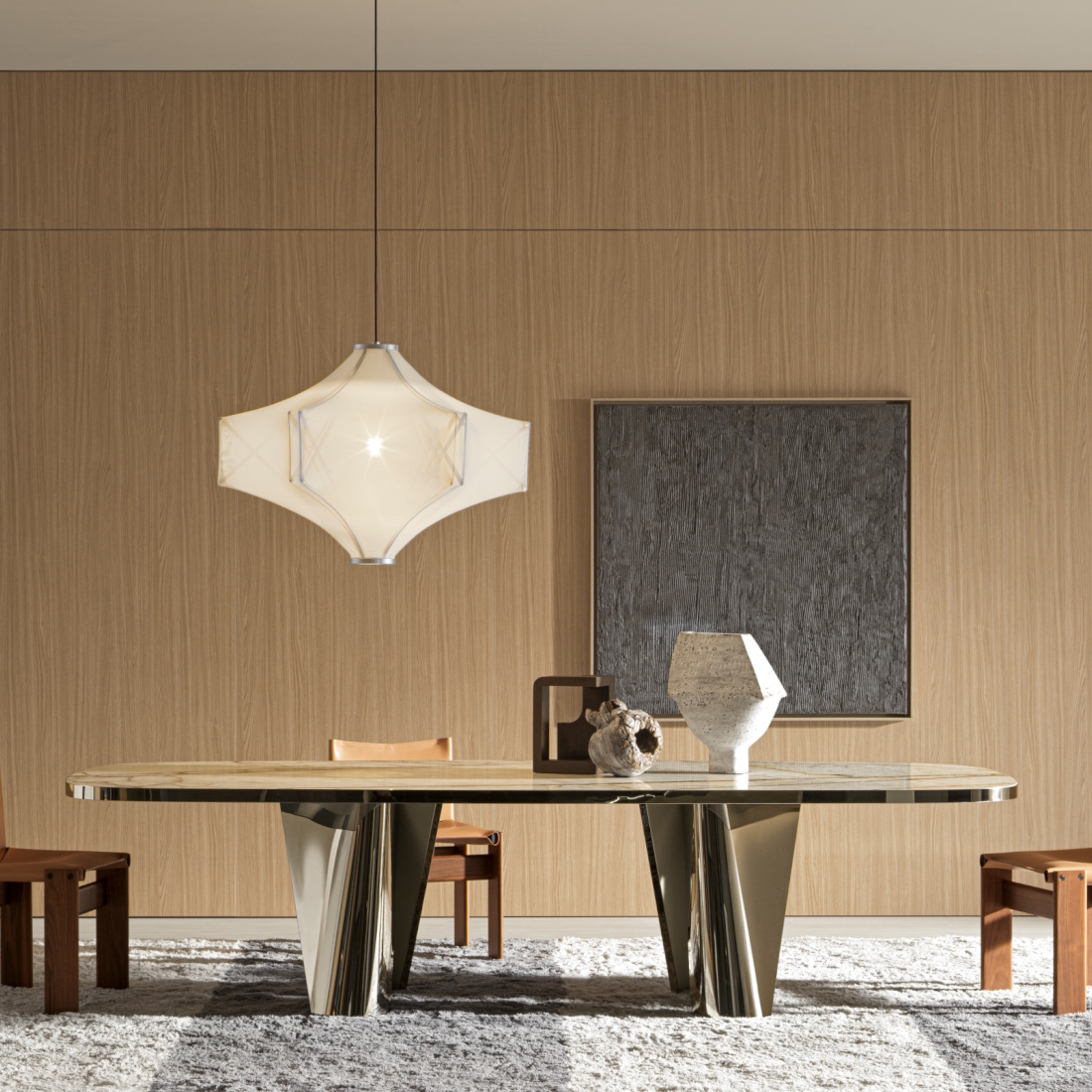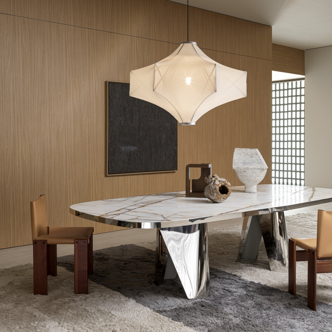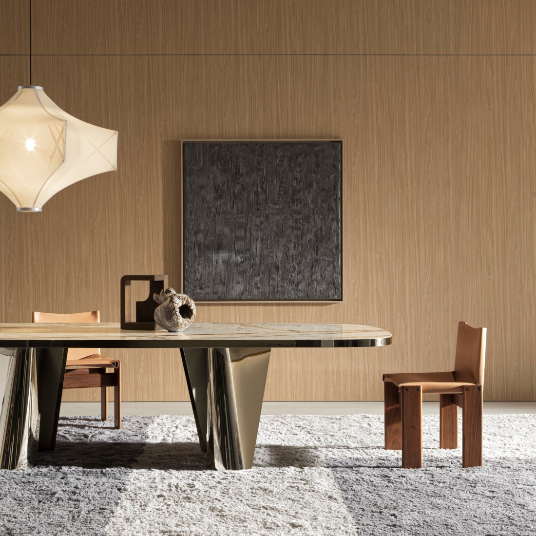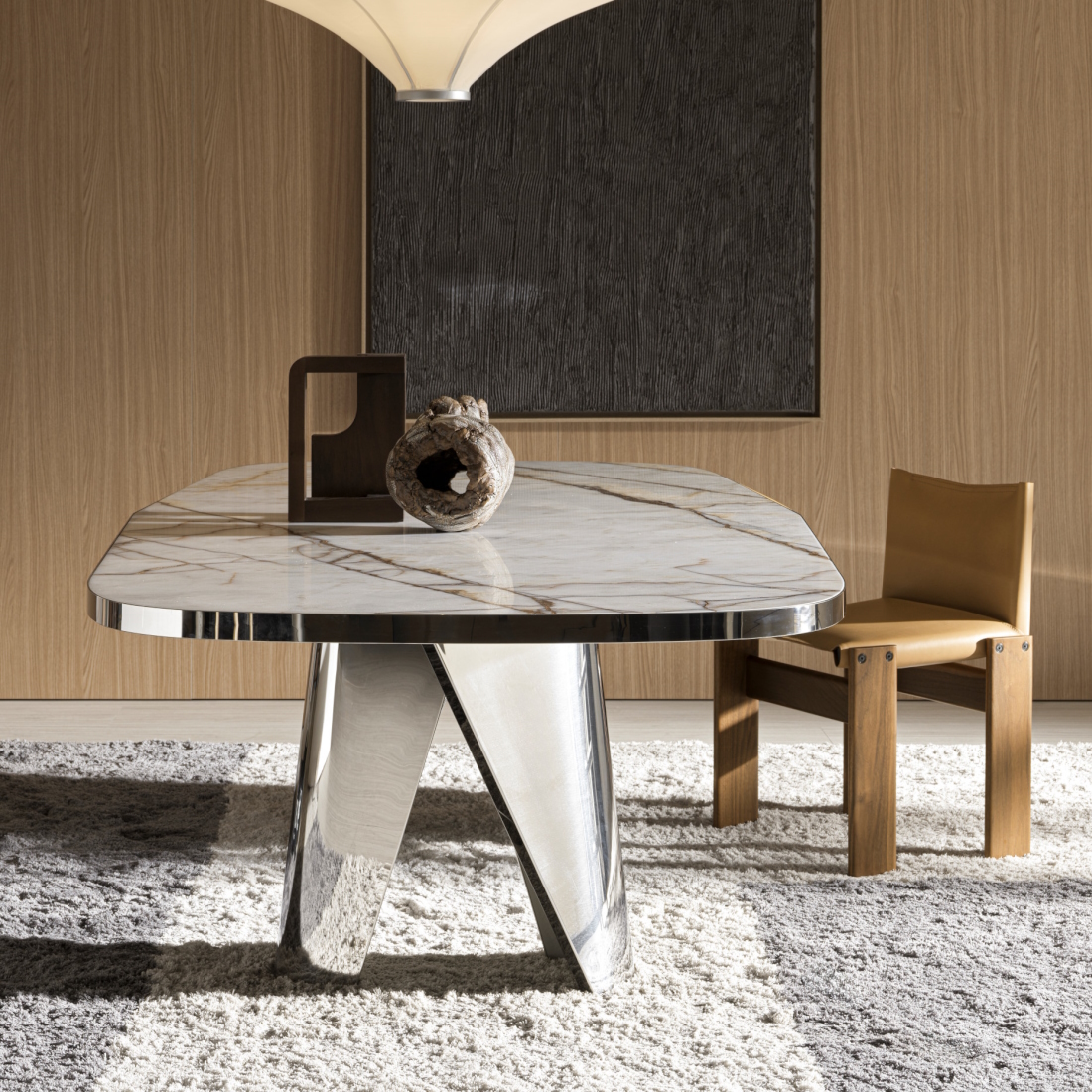 Sculptural form and layered materiality converge in the Lise table by Molteni&C, designed by Christophe Delcourt. Its elliptical marble top rests on two interlocking curved bases, introducing quiet tension and architectural rhythm to gallery-inspired dining rooms or expansive interiors shaped by spatial clarity.