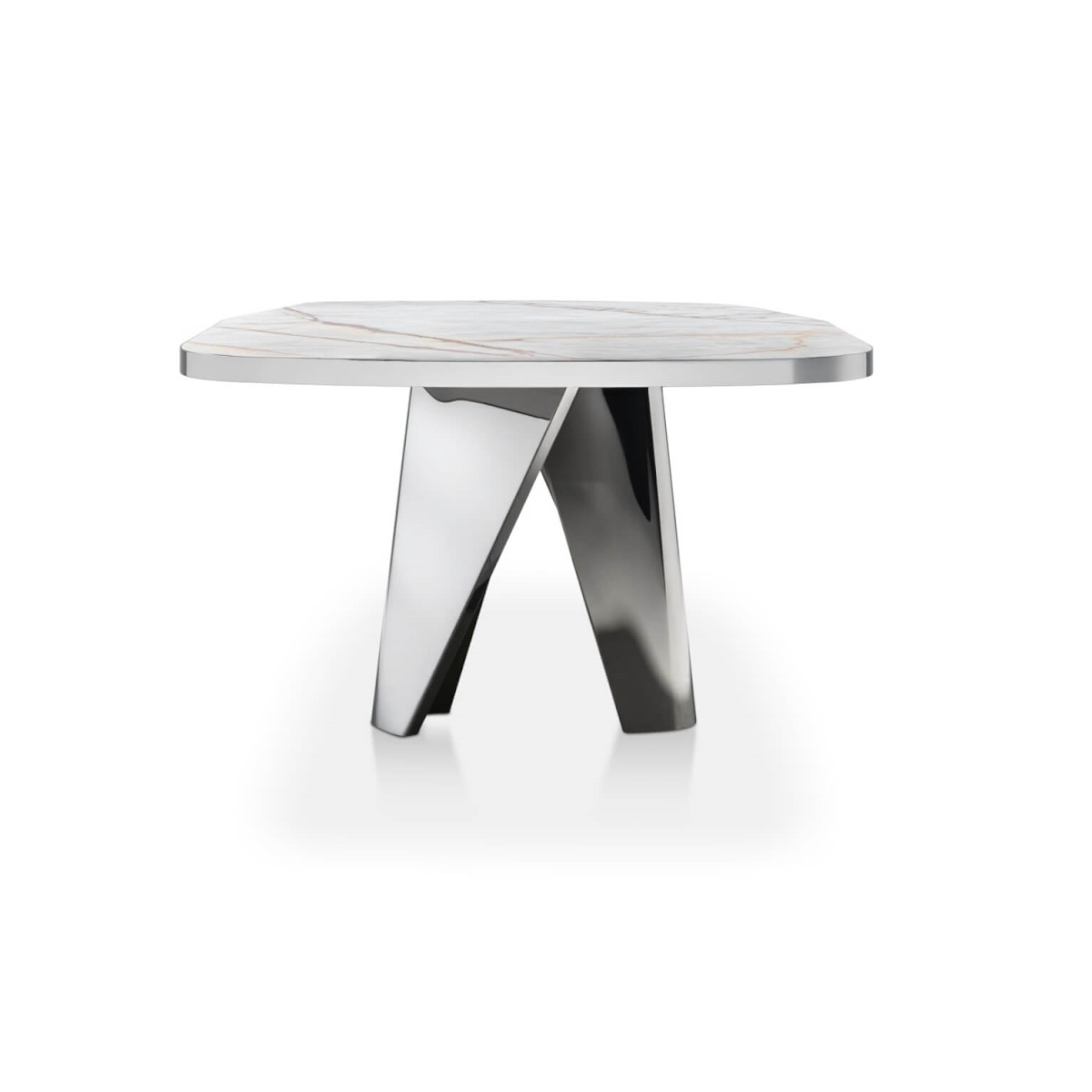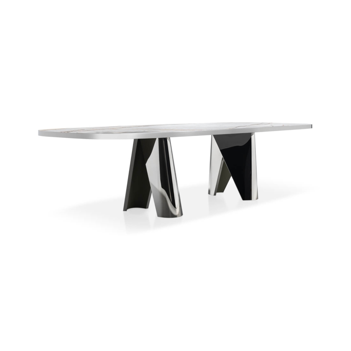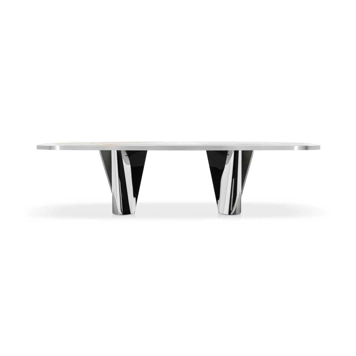The structure and top frame are made from shiny steel, providing a sleek and modern foundation for the dining table.