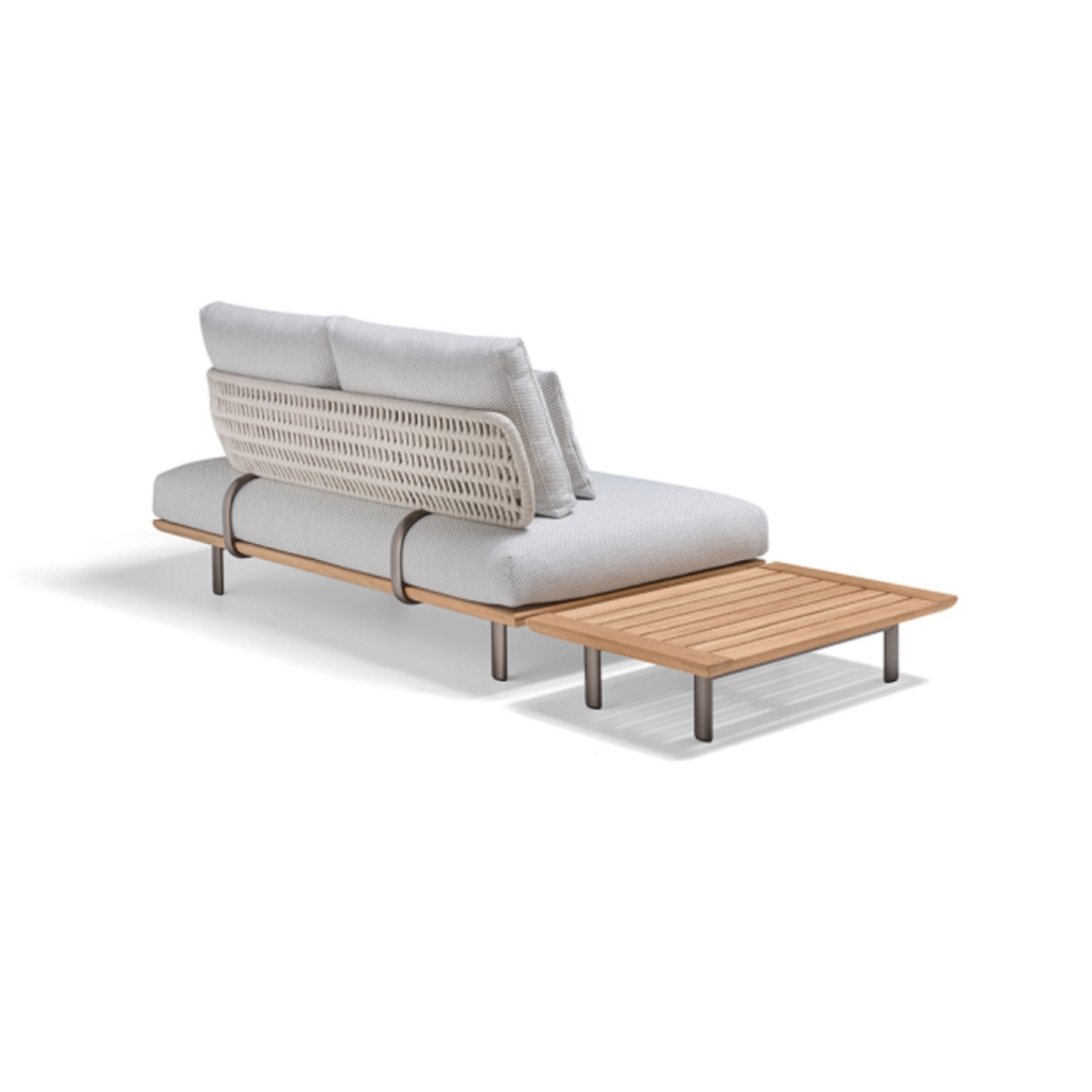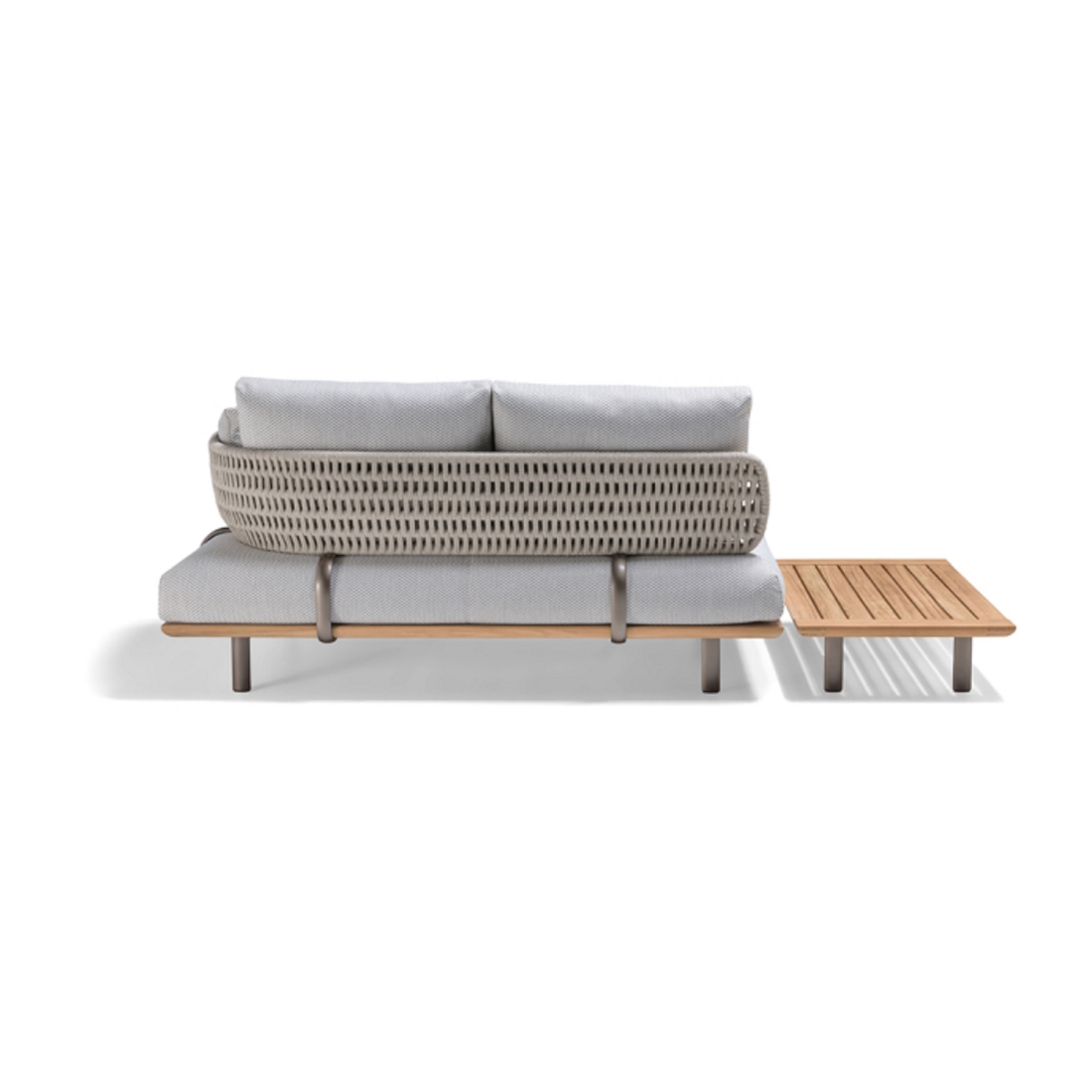 Engineered for modular adaptability, each unit integrates a C-shaped aluminium side element, offering spatial cohesion and functional continuity. Slender feet mirror the sweep of the backrest, while wide rear stabilisers provide structural integrity. This teak and rope outdoor seating system brings refined construction and sculptural modularity to terraces, courtyards, and architect-designed garden lounges.