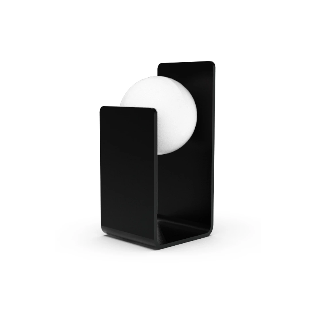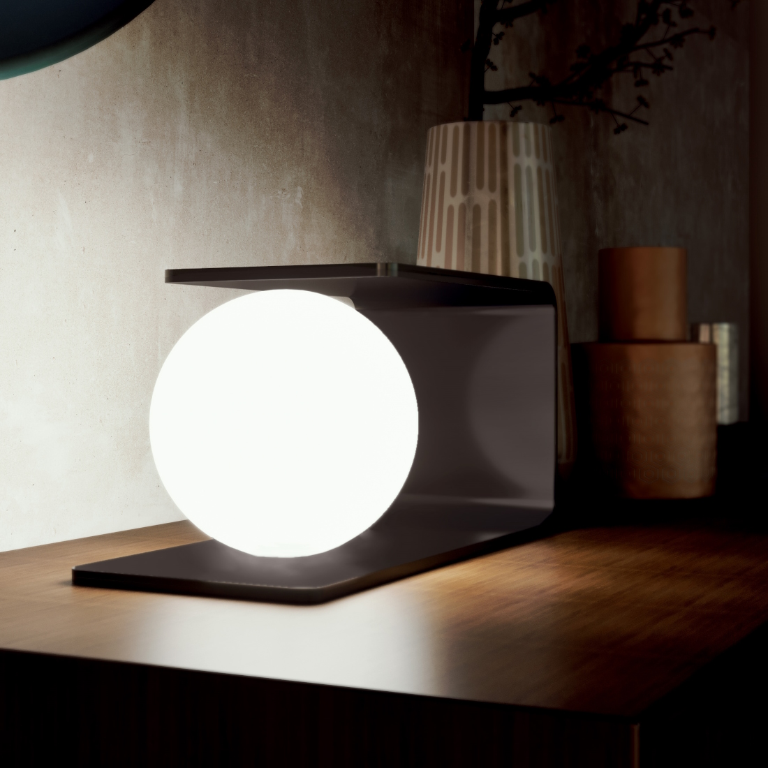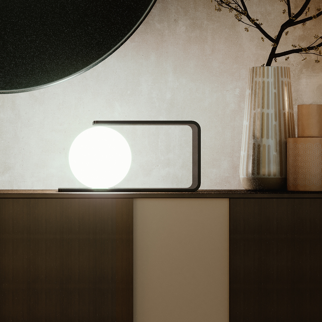 A pure expression of form and balance, the Morsetto table lamp by Penta Light introduces structured clarity to desks, sideboards, and minimalist interiors. Designed by Carlo Colombo, its geometric frame in painted metal supports a floating acid-etched glass sphere—casting a warm, diffused glow with architectural restraint.