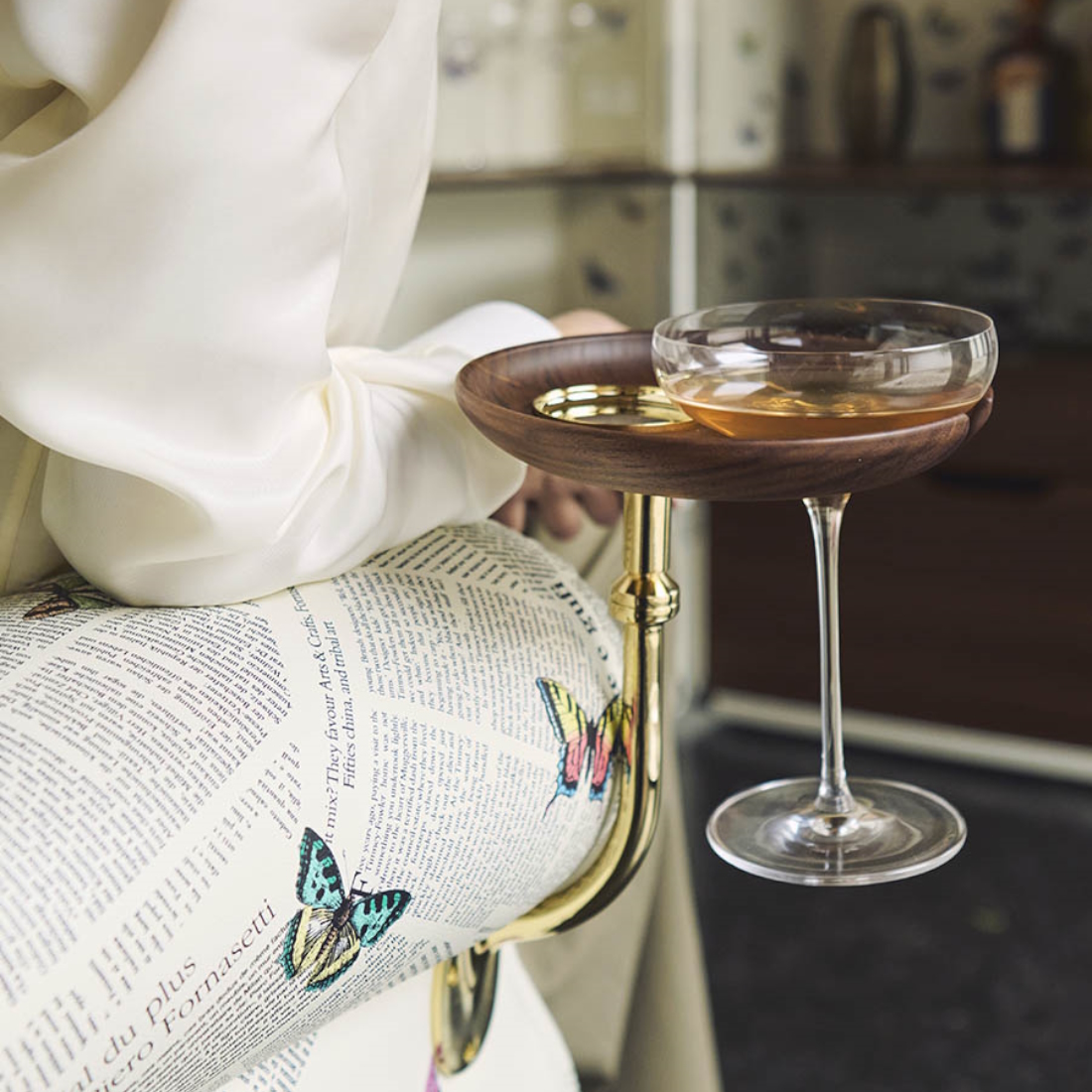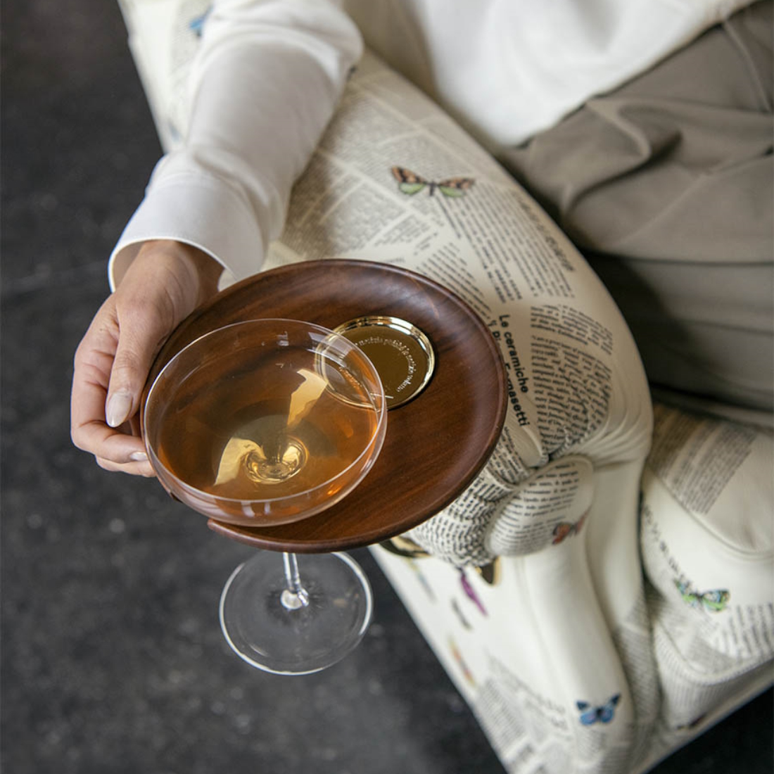 The optional glass holder is attached to the armrest. The plate arm is fixed and made from bronze, in a gold finish. The plate is crafted from wax-treated natural oak (26) and is enriched with a small brass ashtray, engraved with the Poltrona Frau logo.