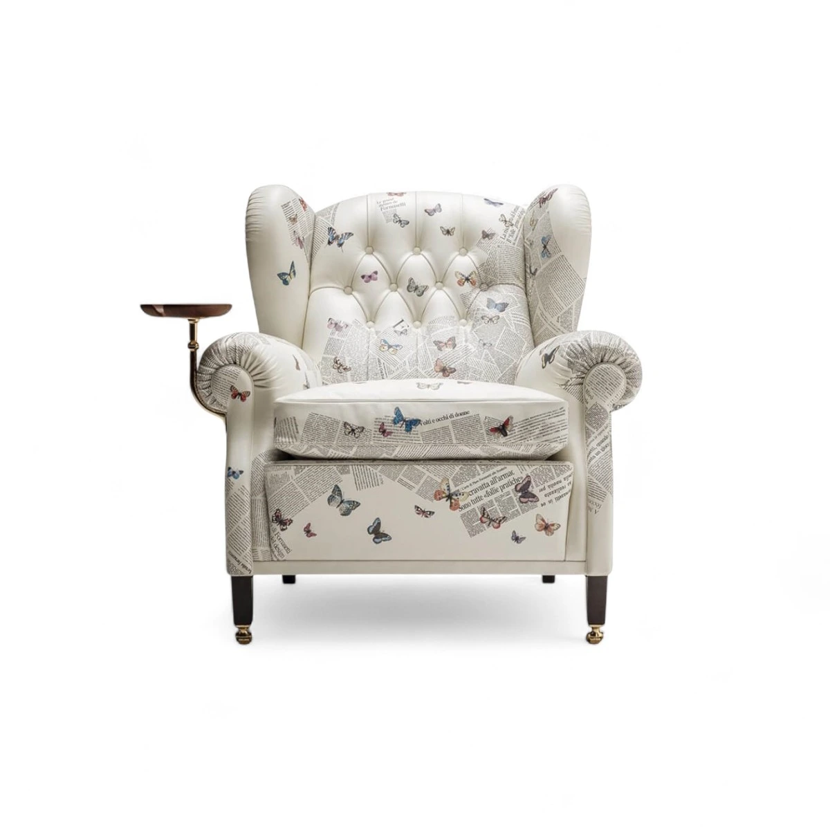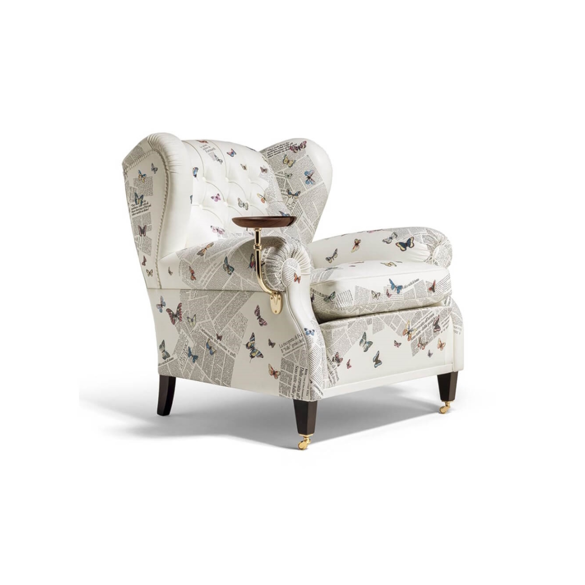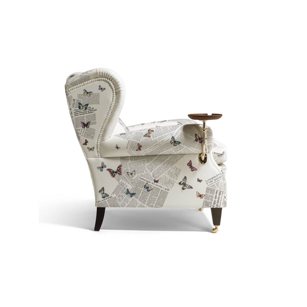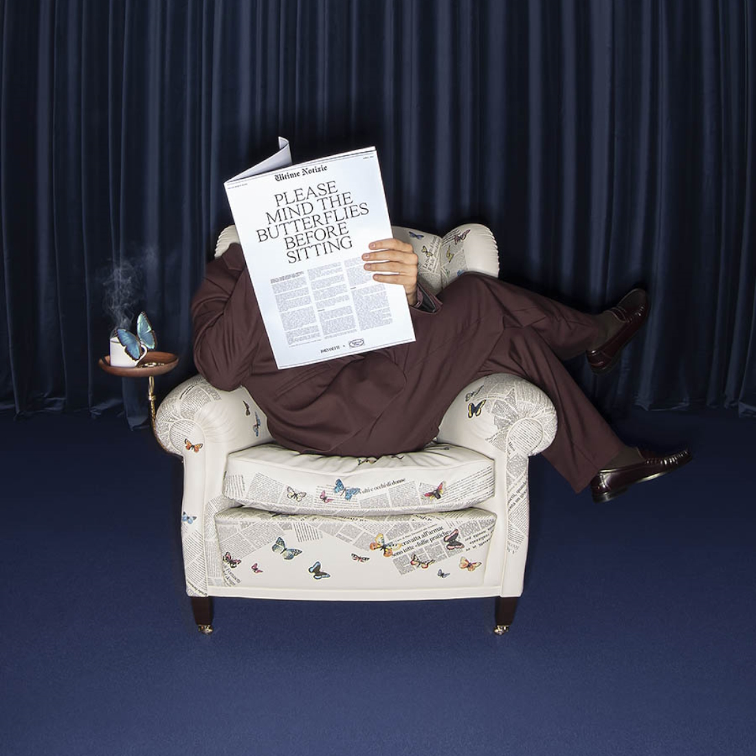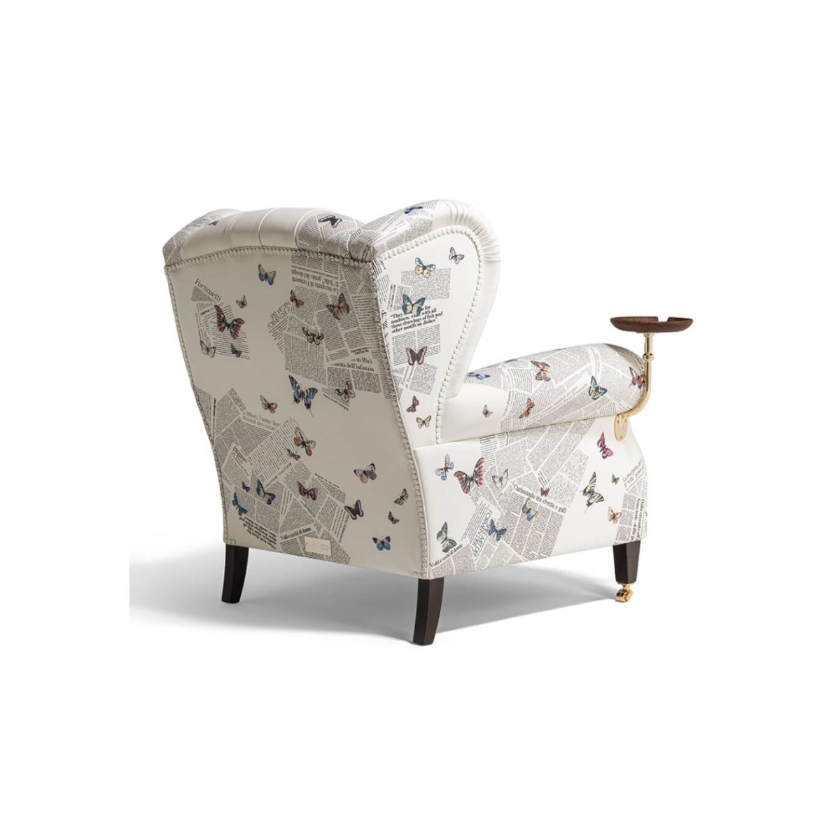 Created in collaboration with Fornasetti, the Pelle Frau® leather upholstery becomes a canvas for the Ultime Notizie print—a layered trompe-l’œil of butterflies and archival clippings. Crafted in Italy and individually numbered, this limited-edition armchair unites traditional upholstery with cultural provocation and rarefied Italian craft.